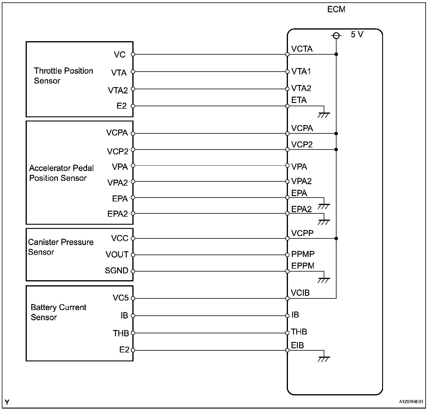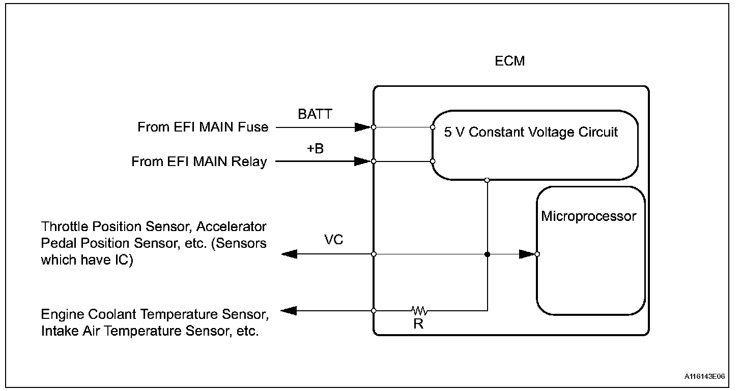 The ECM constantly generates 5 V power from the battery voltages supplied to the +B (BATT) terminal to operate the microprocessor. The ECM also provides this power to the sensors through the VC output circuit.