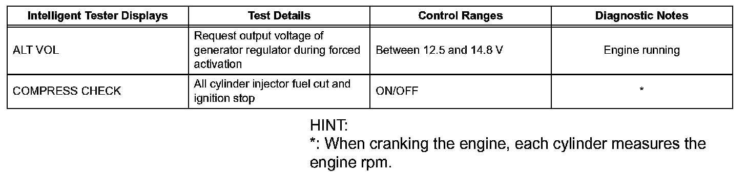 In this ACTIVE TEST, the fuel and ignition of all cylinders is cut, and cranking occurs for approximately 10 seconds. Then, each cylinder measures the engine rpm. If a cylinder's engine rpm is higher than the others, that cylinder's compression pressure is compared to the others, and whether or not the compression pressure is low can be determined.