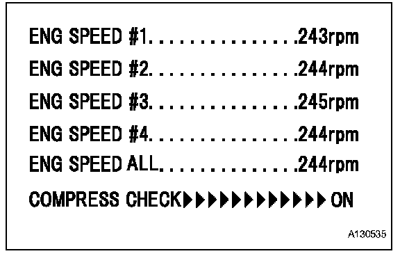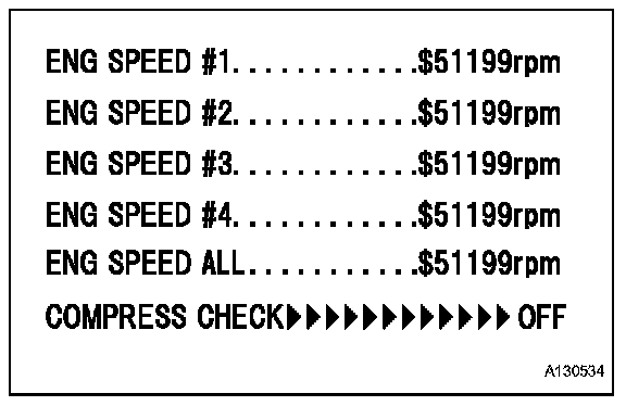 HINT: After performing the above procedure, the ACTIVE TEST's COMPRESS CHECK will start. Fuel injection for all cylinders is prohibited, and the each cylinder's engine rpm measurement will enter standby.