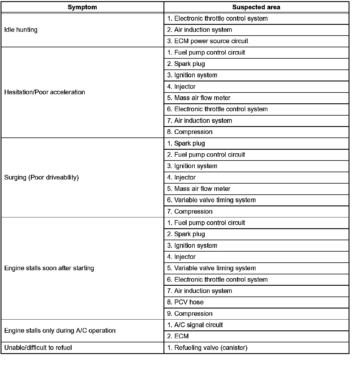 HINT: Use the table above to help determine the cause of the problem symptom. The potential causes of the symptoms are listed in order of probability in the "Suspected area" column of the table. Check each symptom by checking the suspected areas in the order they are listed. Replace parts as necessary.