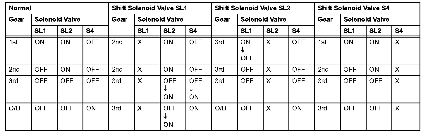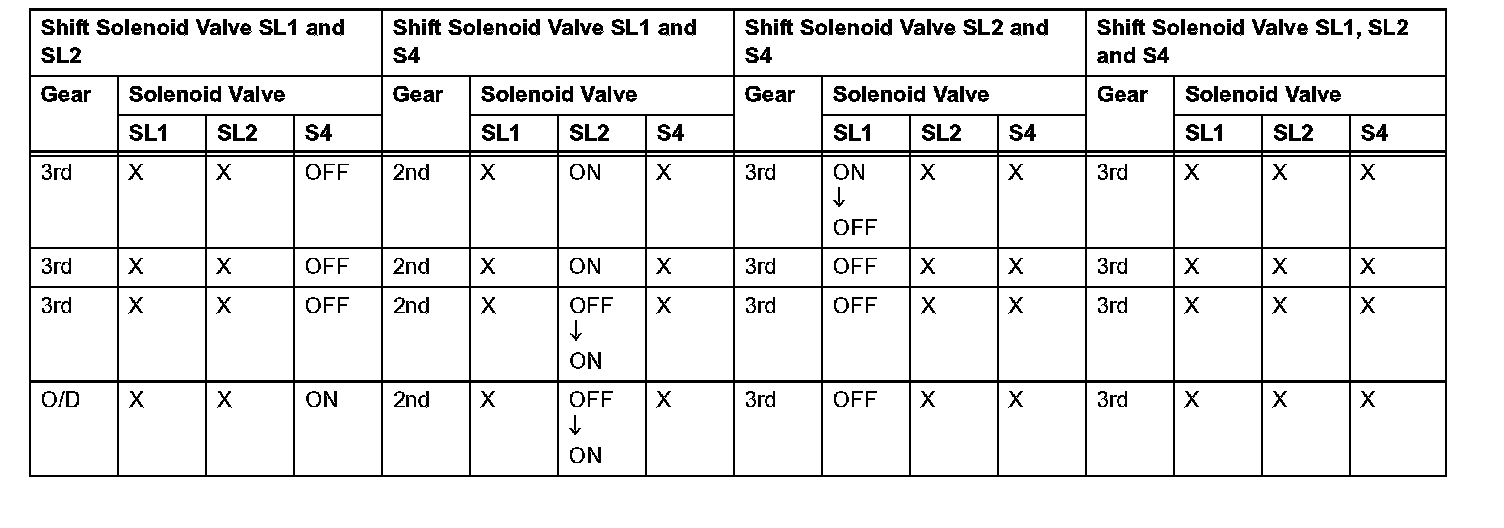 If any of the shift solenoid valve circuits develops an open or short, the ECM turns the other shift solenoid ON and OFF in order to shift into the gear positions shown in the table.