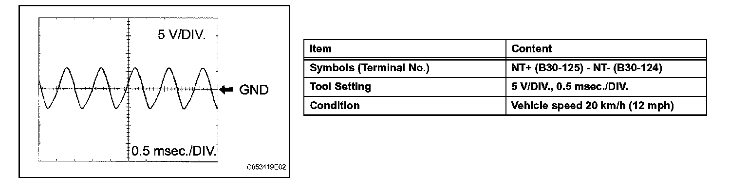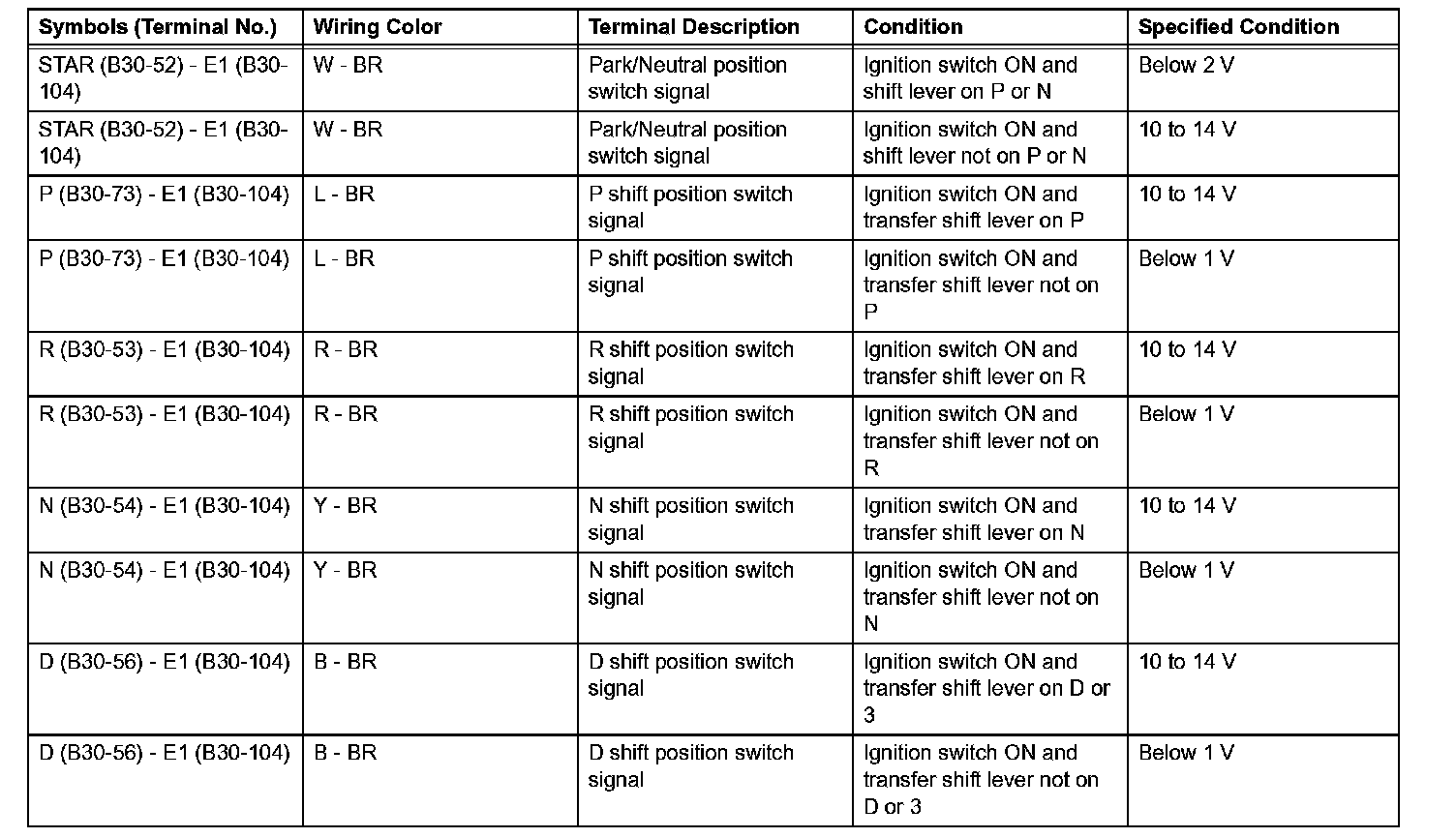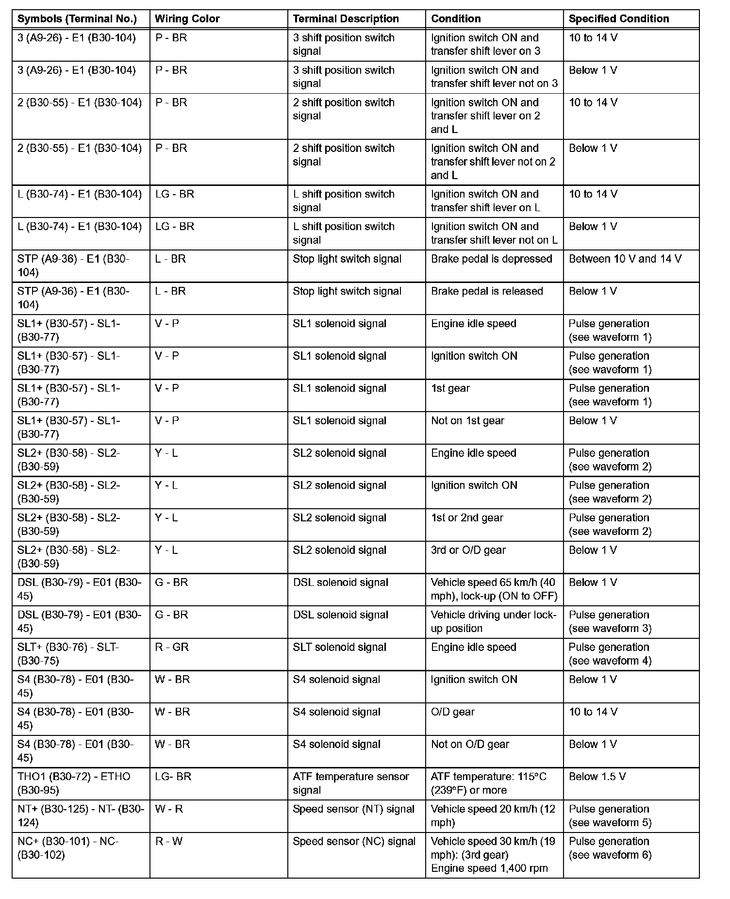 In the table, first follow the information under Condition. Look under Symbols (Terminal No.) for the terminals to be inspected. The standard voltage between the terminals is shown under "Specified Condition".
