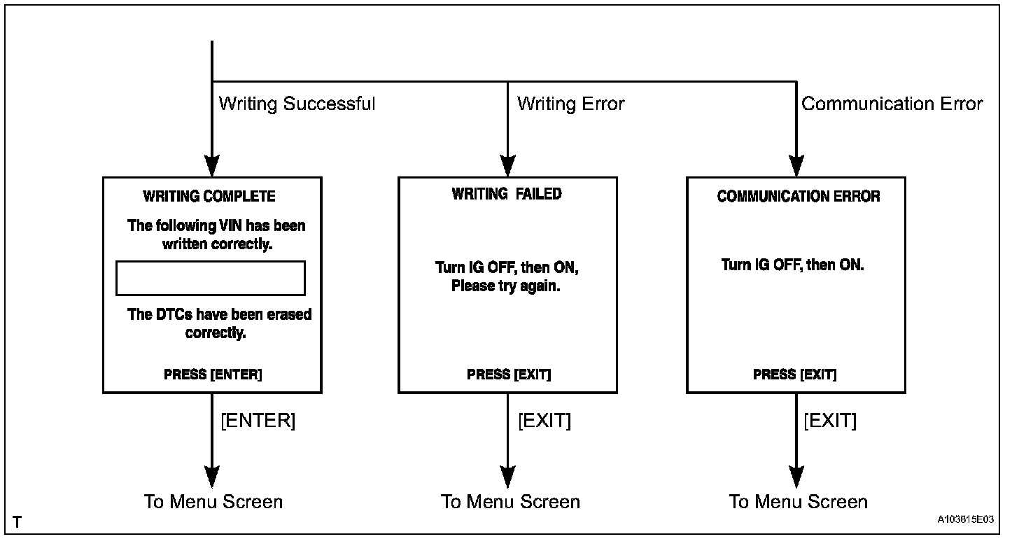 c. Write VIN: Explains the VIN writing process in a flowchart. This process allows the VIN to be input into the ECM. If the ECM is changed, or the vehicle VIN and ECM VIN do not match, the VIN can be registered or overwritten in the ECM by following this procedure.