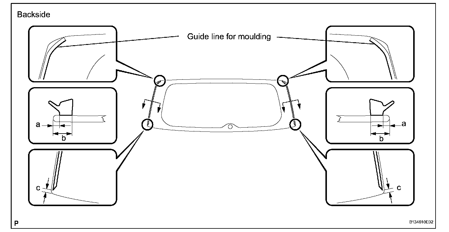 1. Hold the back window glass in place securely with tape or equivalent until the adhesive has hardened.