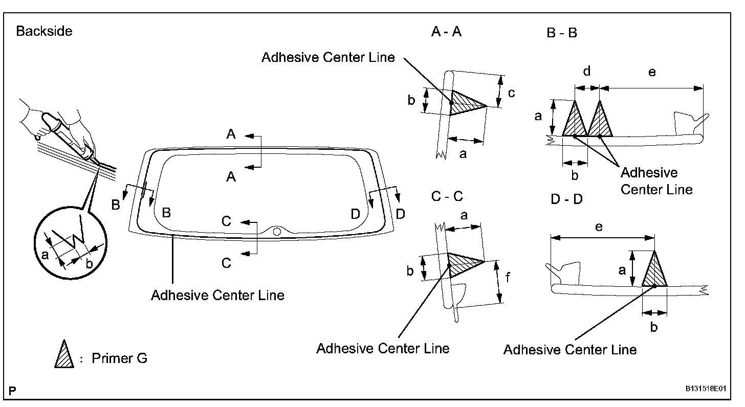 b. Using a brush or sponge, apply Primer G to the contact surface of the back door glass.