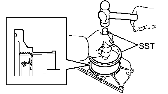 c. Using SST, tap in a new oil seal until its surface is flush with the oil seal retainer edge.