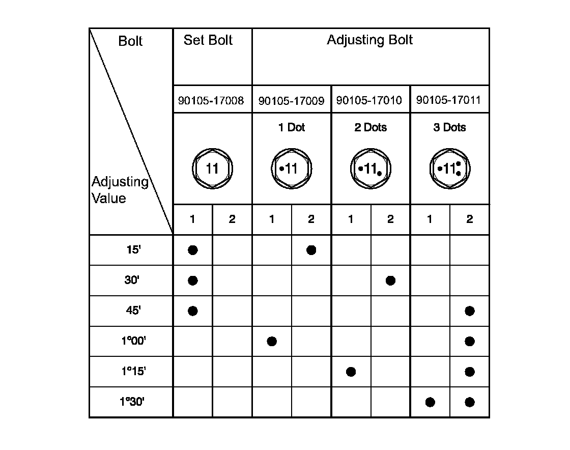If the camber is not within the specification, estimate how much additional camber adjustment will be required and select the camber adjusting bolt using the following table.