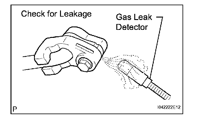 c. Using a gas leak detector, check the refrigerant line for leakage.