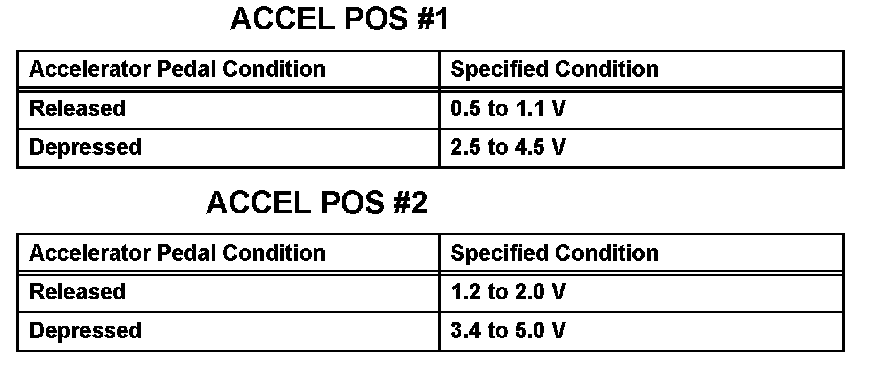 5. Operate the accelerator pedal, and then check that the ACCEL POS #1 and ACCEL POS #2 values are within the specifications.