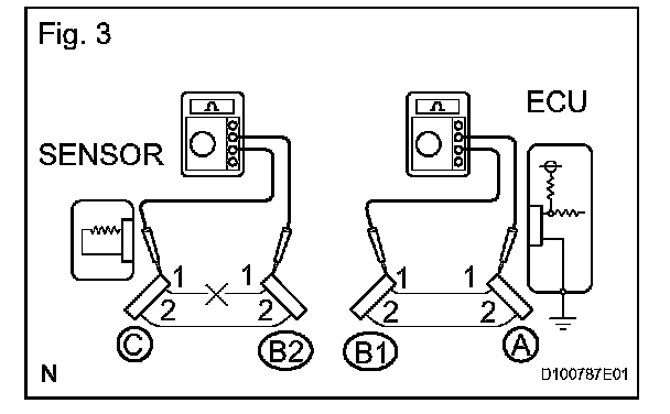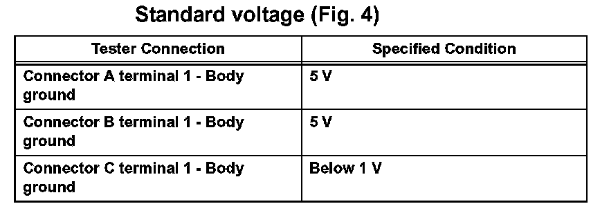 1. In a circuit in which voltage is applied to the ECU connector terminal, an open circuit can be checked by conducting a voltage check. With each connector still connected, measure the voltage between the body ground and these terminals (in this order): 1) terminal 1 of connector A, 2) terminal 1 of connector B, and 3) terminal 1 of connector C.