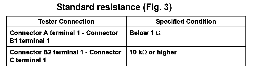 HINT: Measure the resistance while lightly shaking the wire harness vertically and horizontally. If the results match the examples, an open circuit exists between terminal 1 of connector A and terminal 1 of connector C.