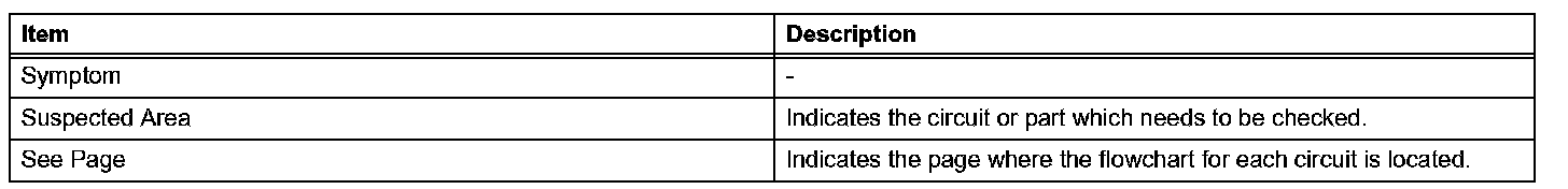 When a "Normal" code is output during a DTC check but the problem is still occurring, use the Problem Symptoms Table. The suspected areas (circuits or parts) for each problem symptom are in the table. The suspected areas are listed in order of probability. A description of each of the chart's columns is given.
