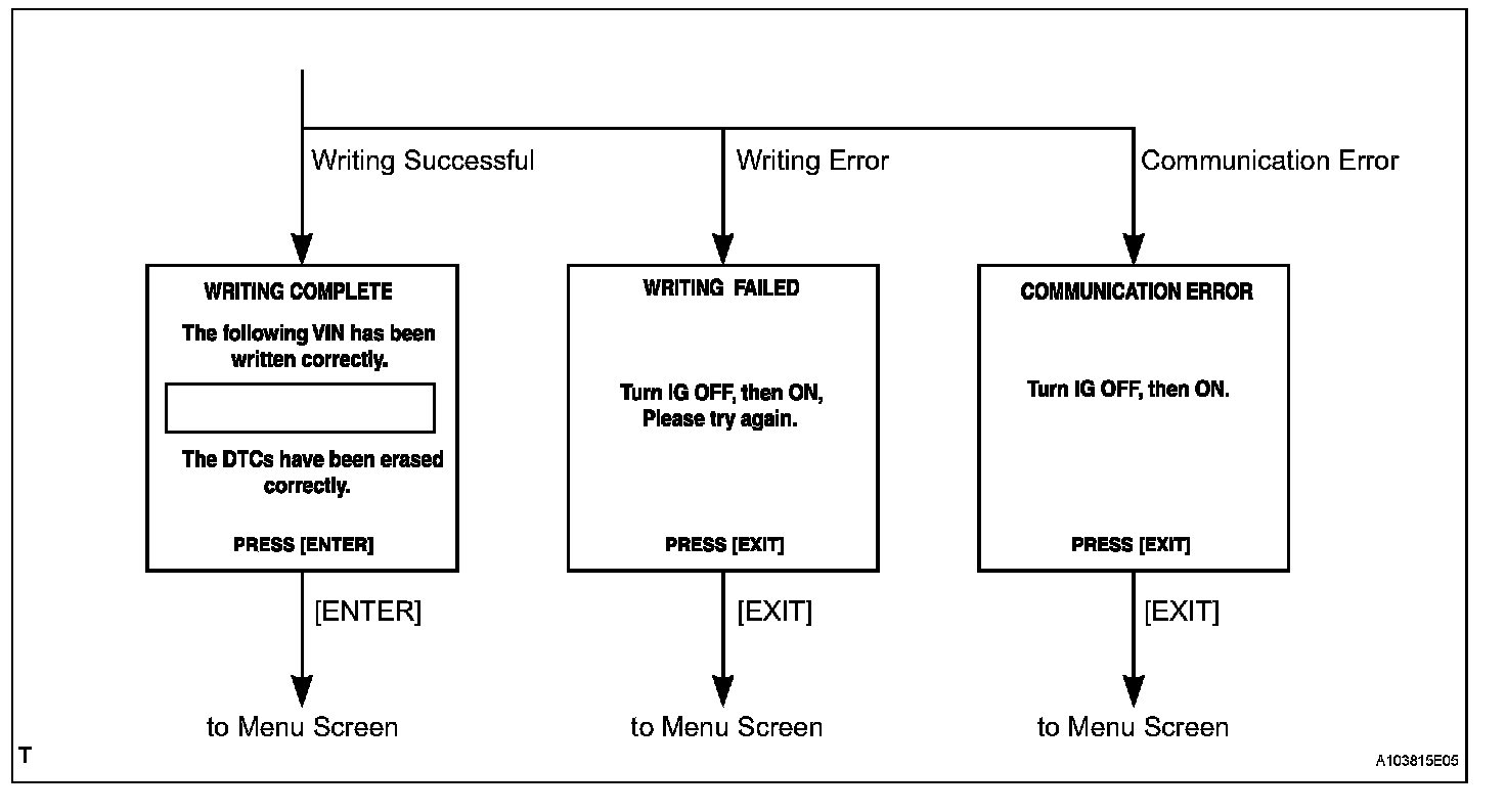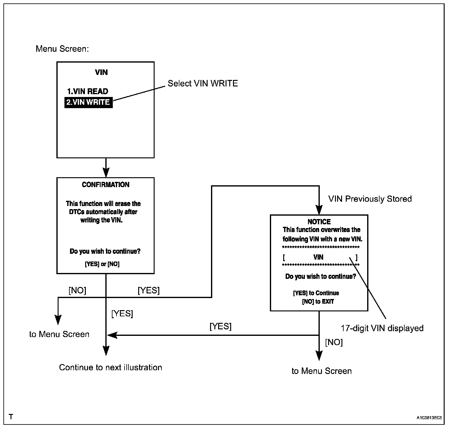 c. Write VIN: Explains the VIN writing process in a flowchart. This process allows the VIN to be input into the ECM. If the ECM is changed, or the vehicle VIN and ECM VIN do not match, the VIN can be registered or overwritten in the ECM by following this procedure.