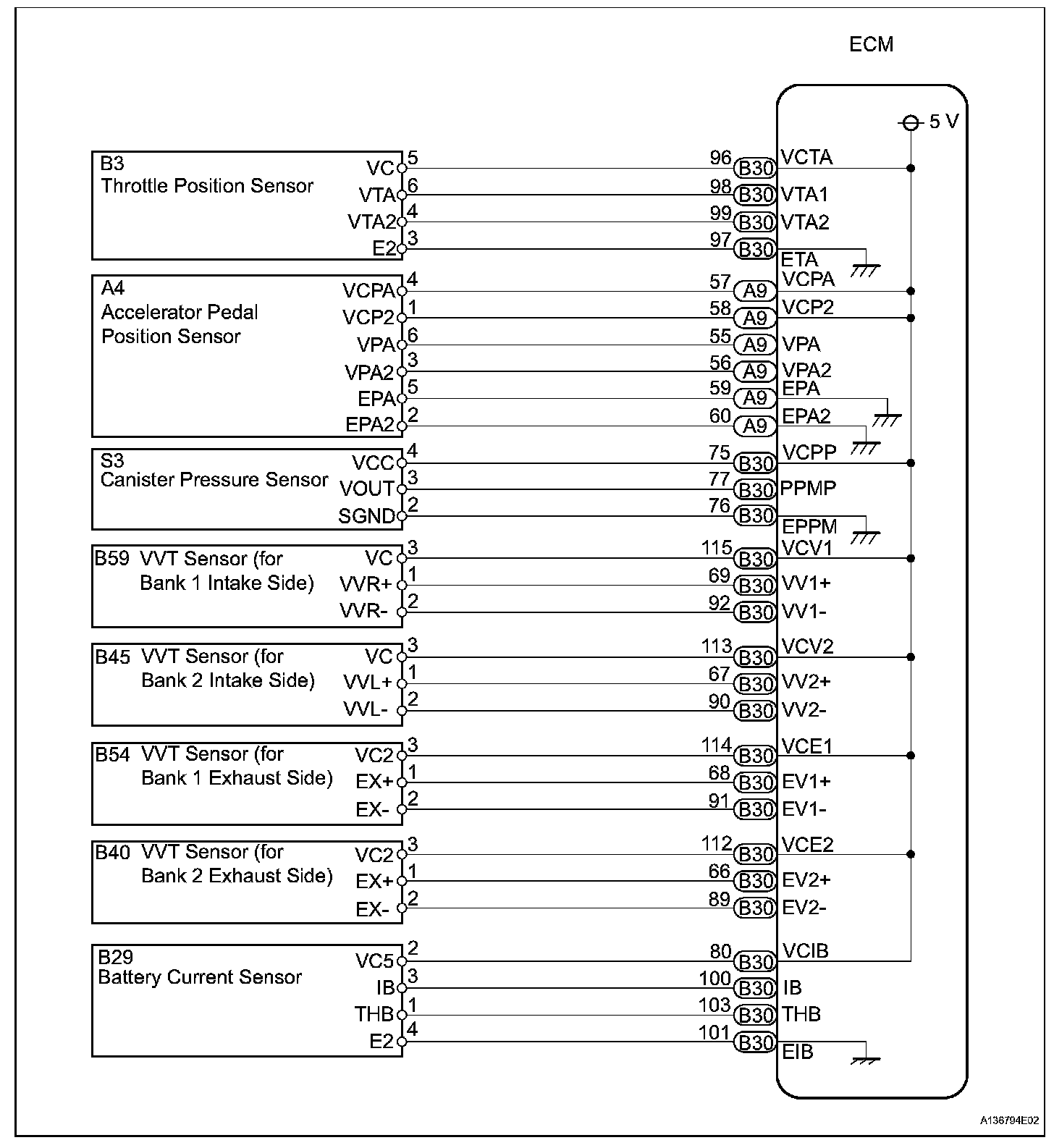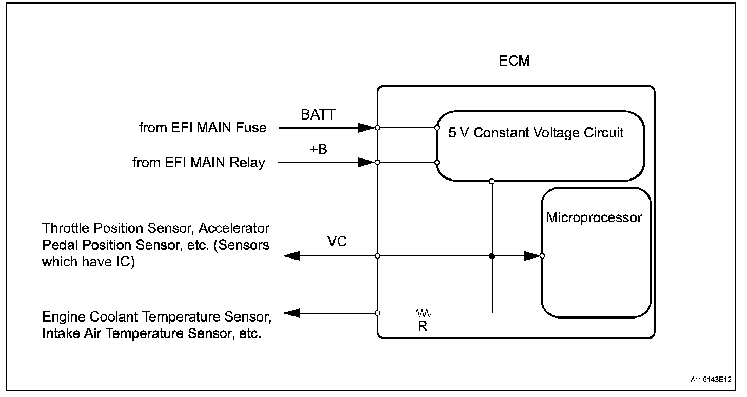 The ECM constantly generates 5 V power from the battery voltages supplied to the +B (BATT) terminal to operate the microprocessor. The ECM also provides this power to the sensors through the VC output circuit.