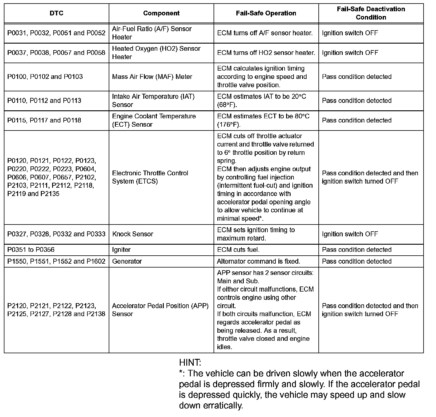 If any of the DTCs are set, the ECM enters fail-safe mode to allow the vehicle to be driven temporarily.