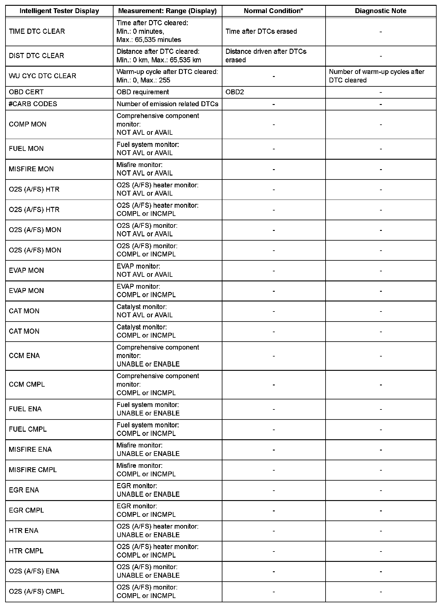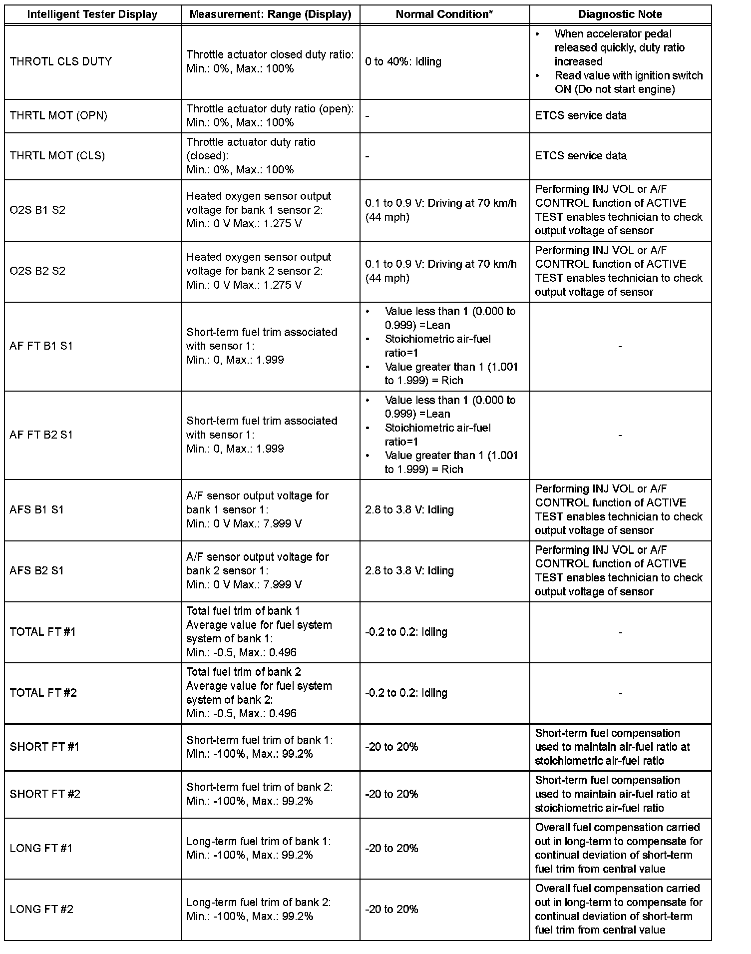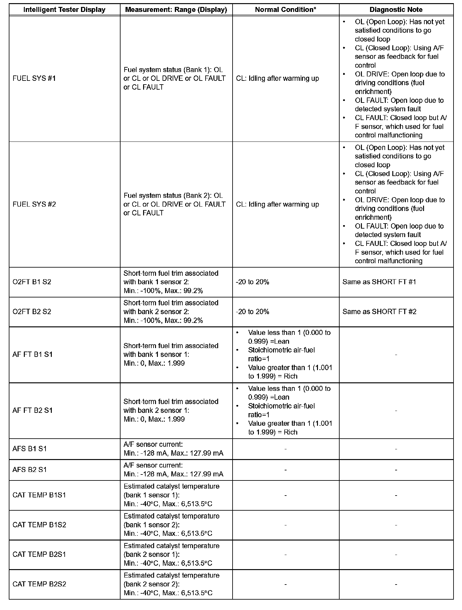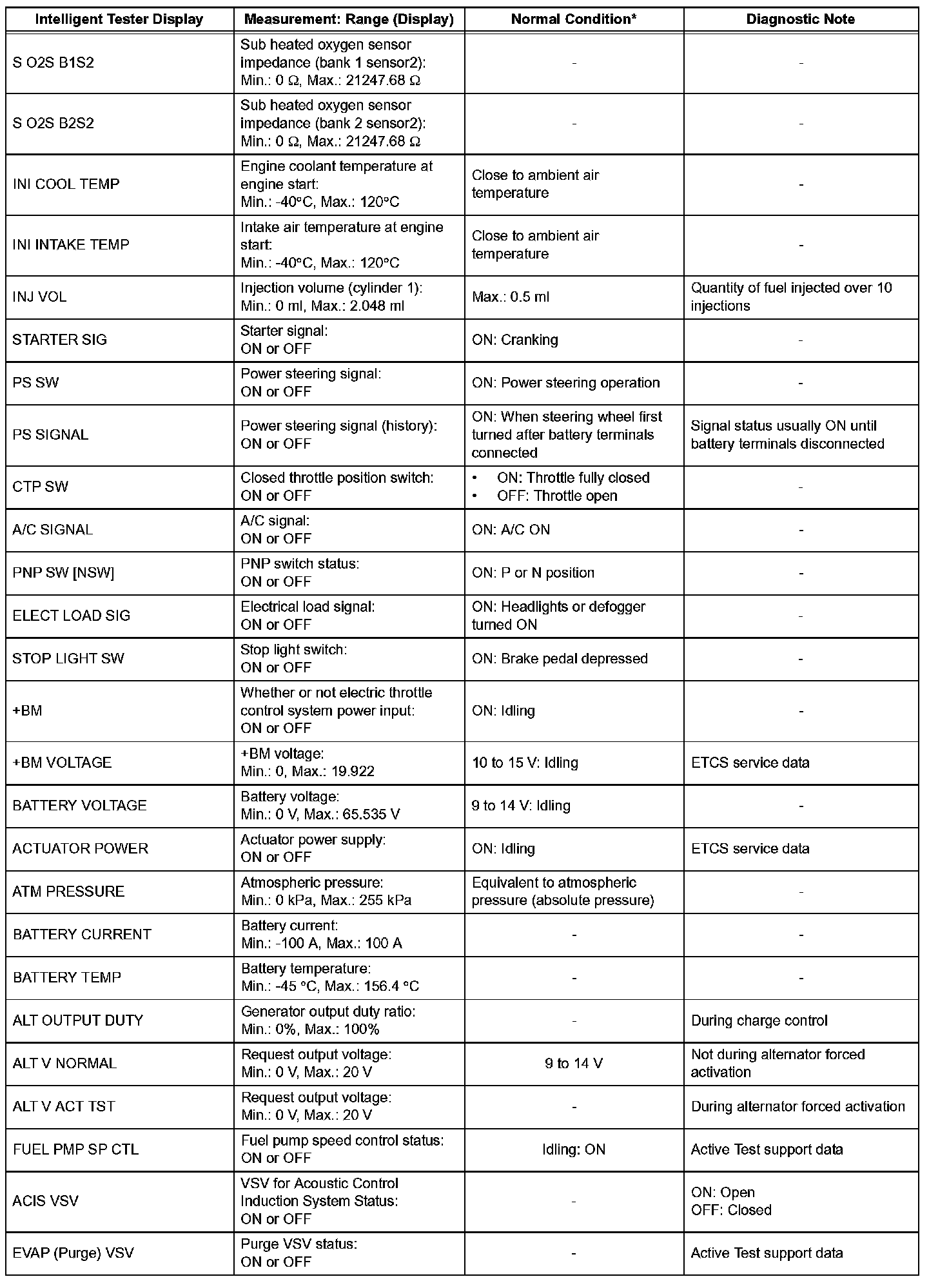 DATA LISTHINT: By reading the DATA LIST displayed on the intelligent tester, values can be checked, including those of the switches, sensors, and actuators, without removing any parts. Reading the DATA LIST as the first step of troubleshooting is one method of shortening diagnostic time.