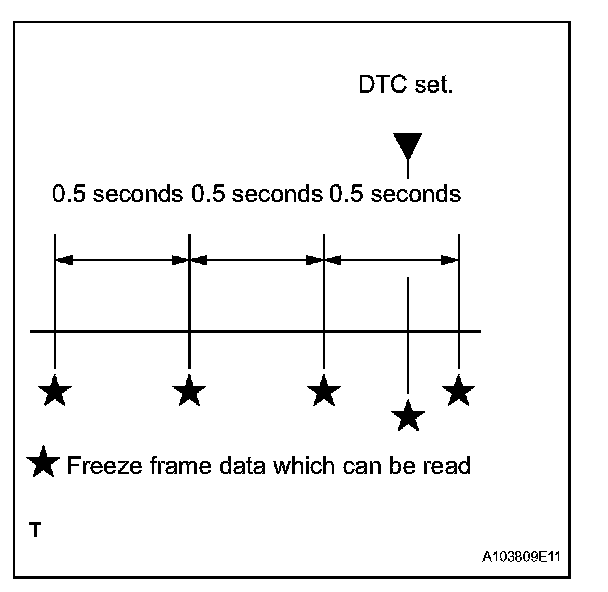 The ECM records engine conditions in the form of freeze frame data every 0.5 seconds. Using the intelligent tester, 5 separate sets of freeze frame data can be checked.