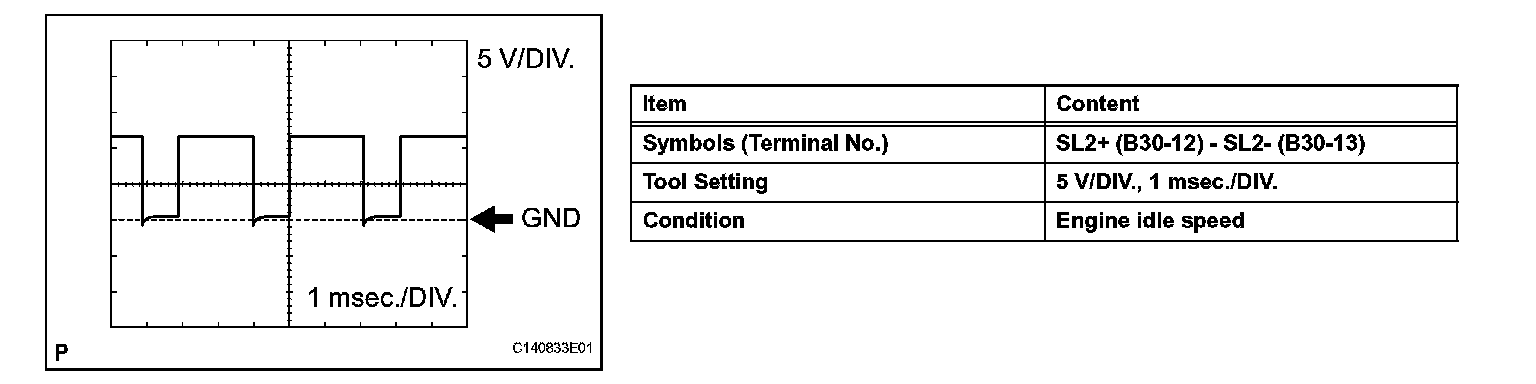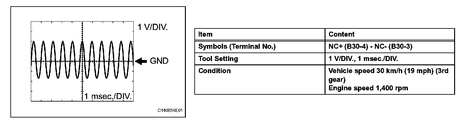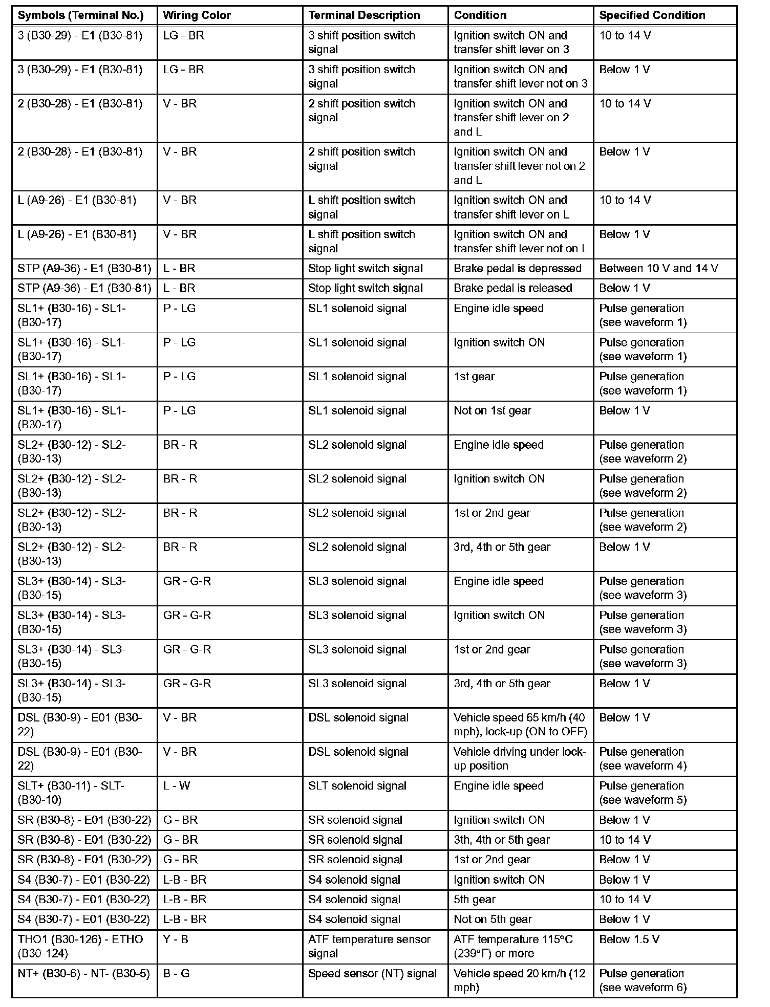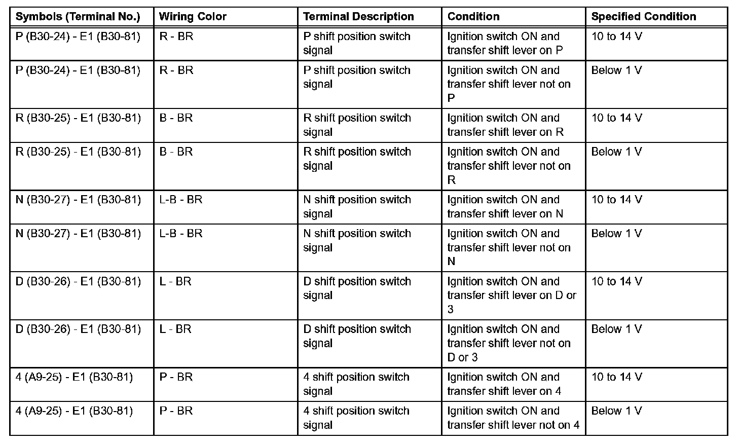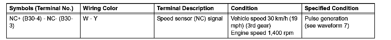 In the table, first follow the information under "Condition". Look under "Symbols (Terminal No.)" for the terminals to be inspected. The standard voltage between the terminals is shown under "Specified Condition".
