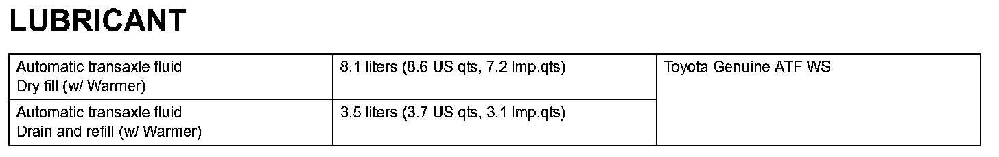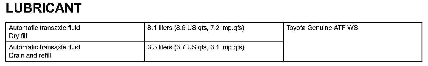 Notice: Using automatic transmission fluid other than "Toyota Genuine ATF Type WS" may cause deterioration in shift quality, locking up of your transmission accompanied by vibration, and ultimately damage the automatic transmission of your vehicle.