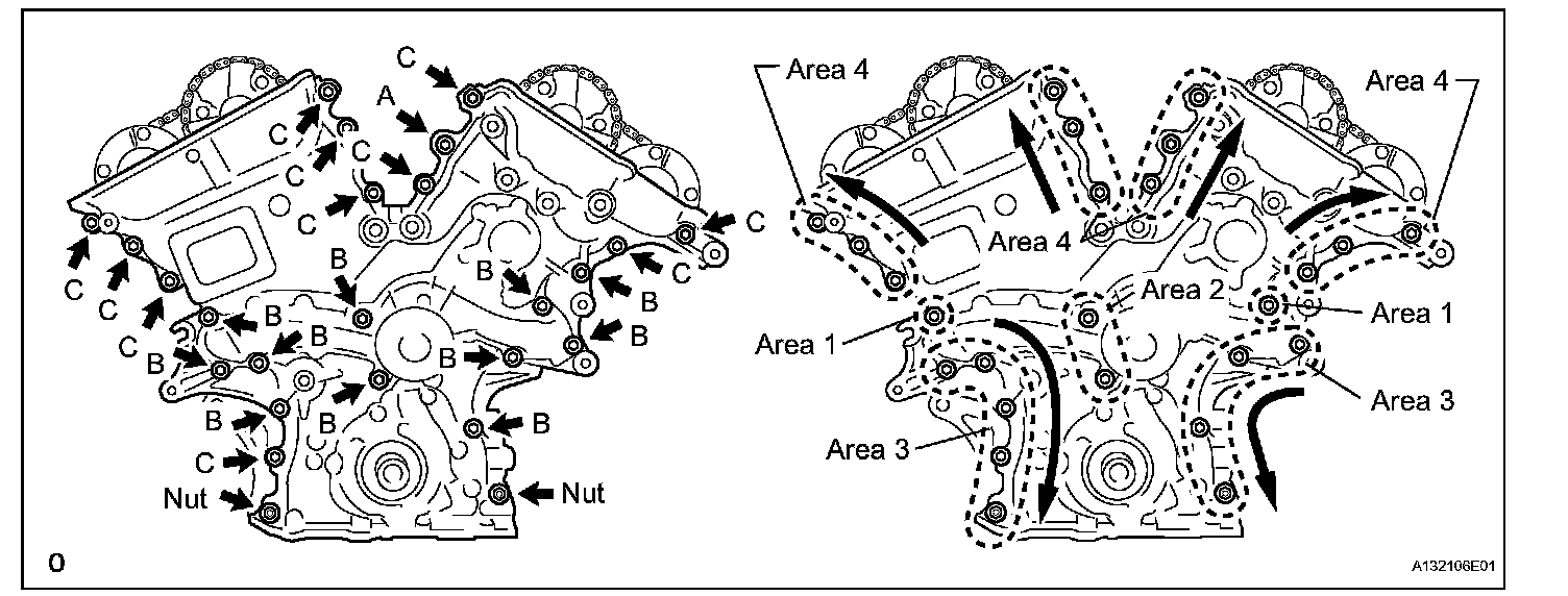 Third pass: Area 4 bolt A 43 Nm (438 kgf-cm, 32 ft. lbs.)
