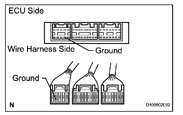 2. Disconnect the ECU connector. Check the ground terminal on the ECU side and wire harness side for bending, corrosion or foreign matter. Lastly, check the contact pressure of the female terminals.