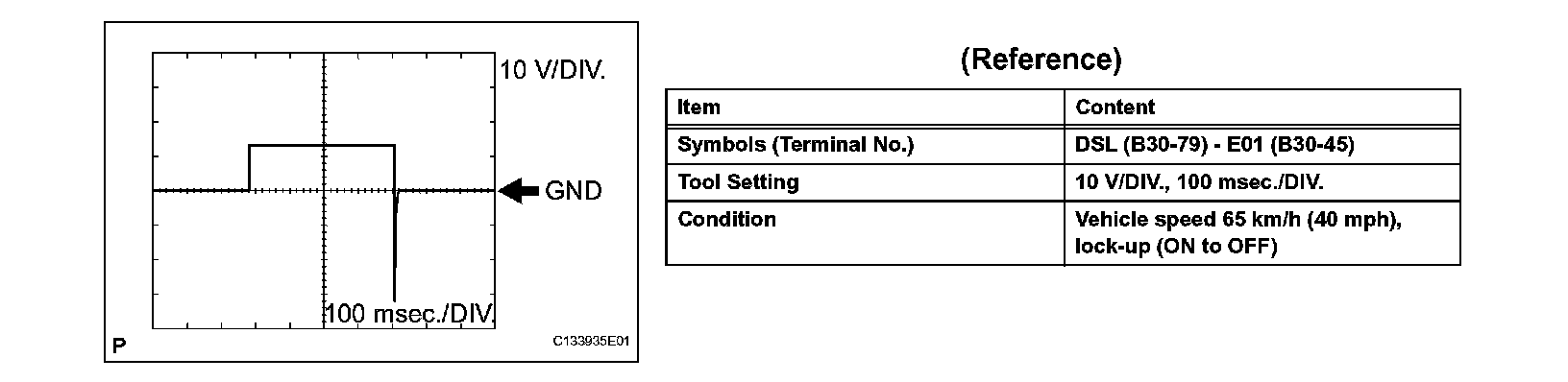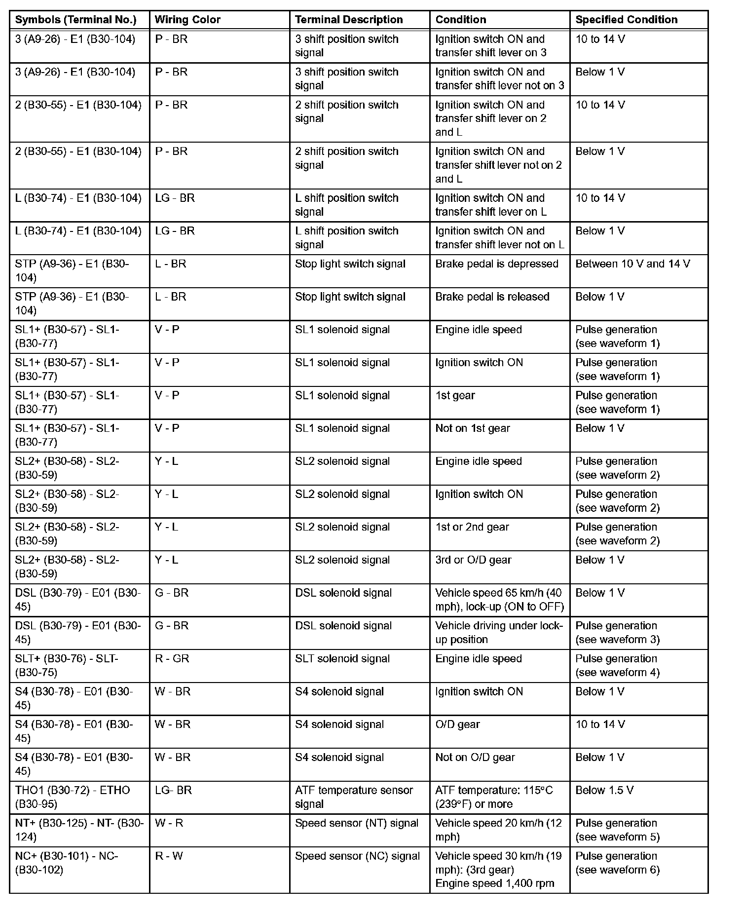 In the table, first follow the information under Condition. Look under Symbols (Terminal No.) for the terminals to be inspected. The standard voltage between the terminals is shown under "Specified Condition".