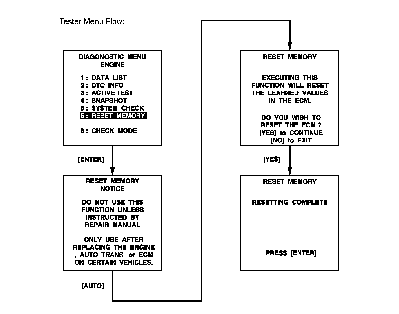 CAUTION: After performing the RESET MEMORY procedures, be sure to perform the ROAD TEST as described earlier. Road Test