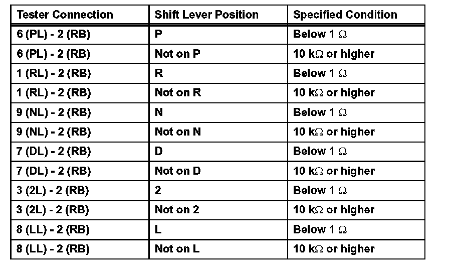 a. Measure the resistance of the switch when the shift lever is moved to each position.