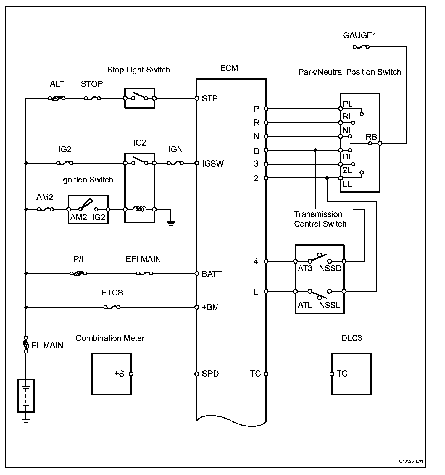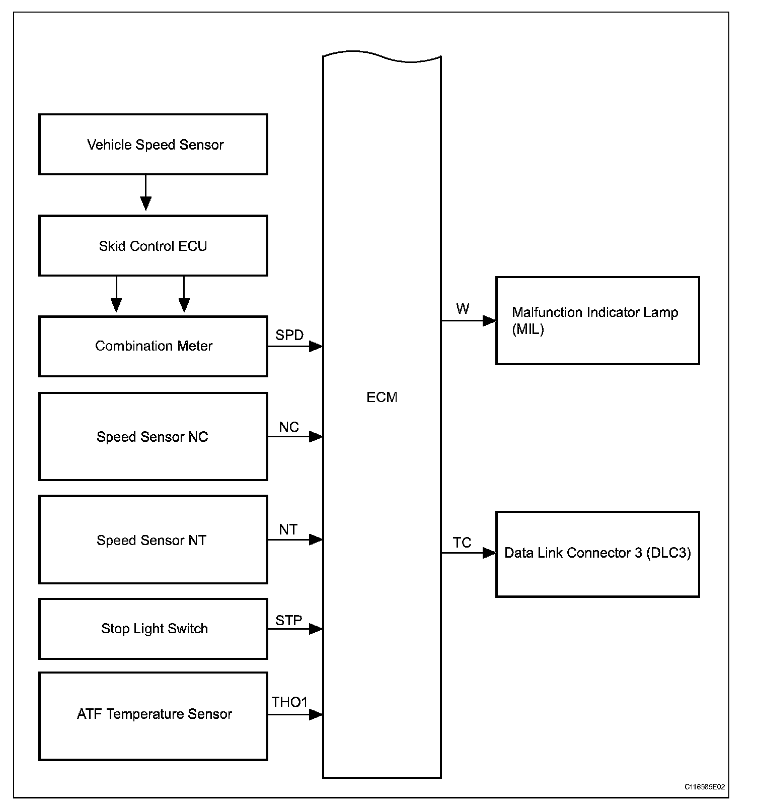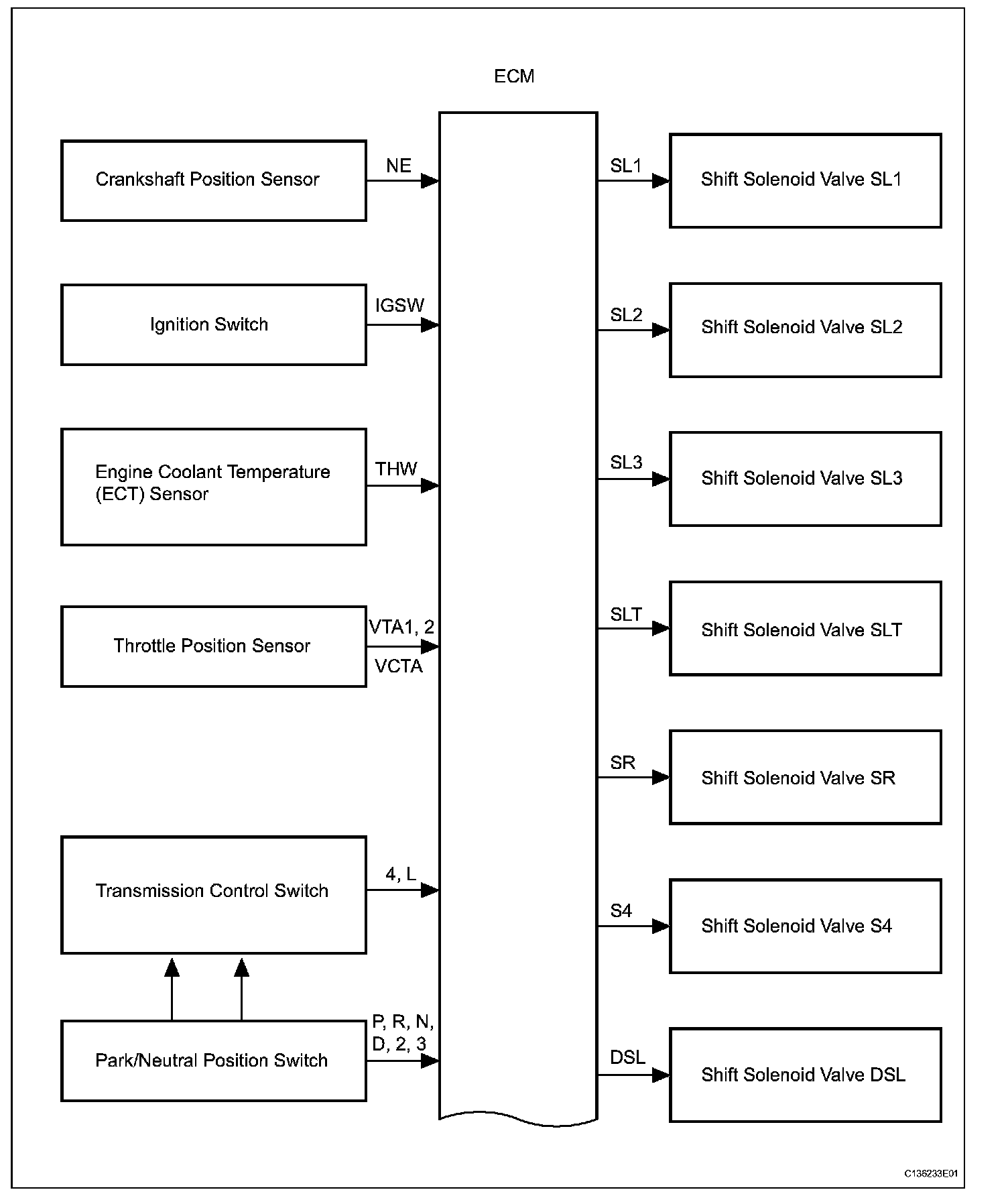 The configuration of the electronic control system in the U151F automatic transaxle is as shown in the chart.
