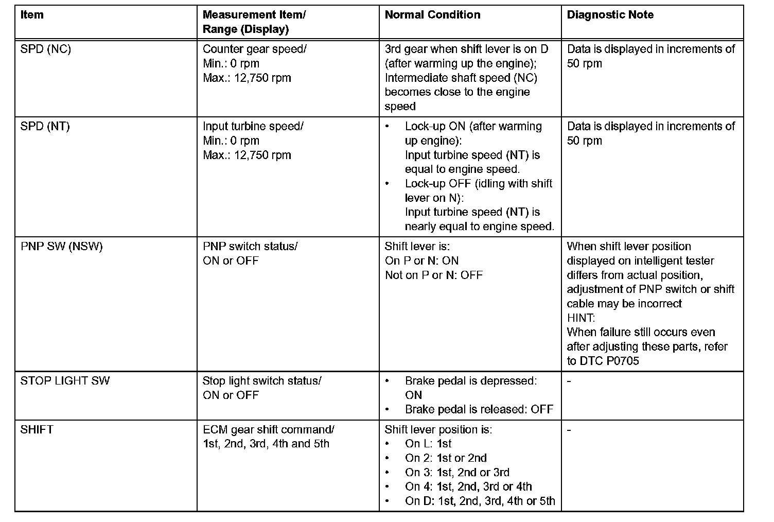 HINT: Using the intelligent tester's DATA LIST allows switch, sensor, actuator, and other item values to be read without removing any parts. Reading the DATA LIST early in troubleshooting is one way to save time.