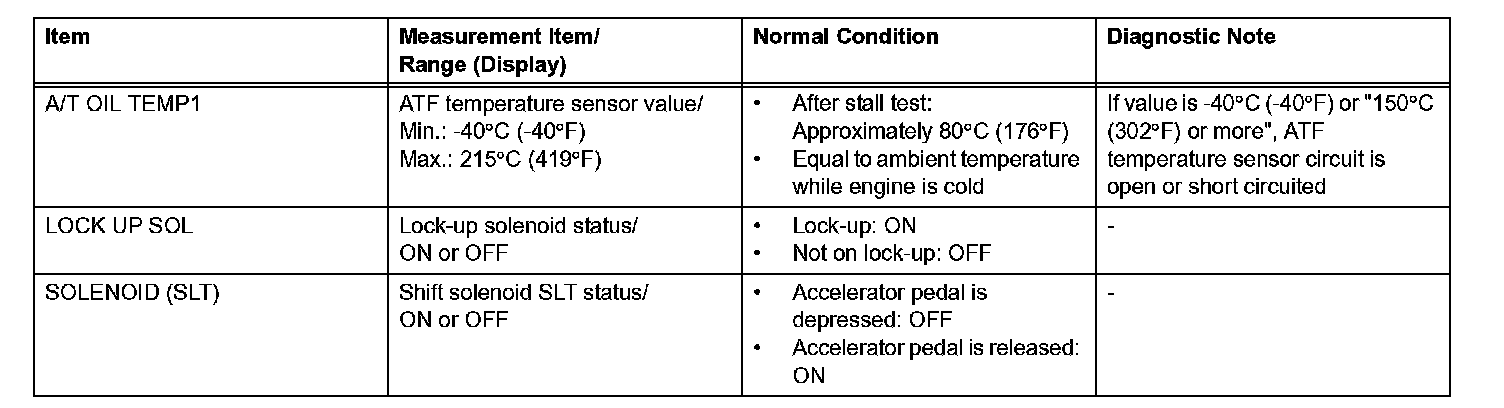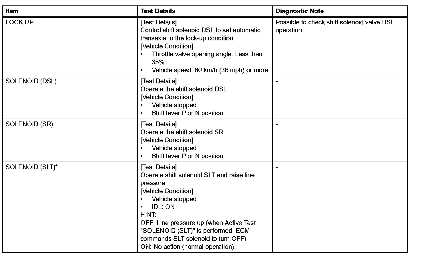 HINT: *: "SOLENOID (SLT)" in the ACTIVE TEST is performed to check the line pressure changes by connecting SST to the automatic transaxle, which is used in the HYDRAULIC TEST as well. Please note that the pressure values in the ACTIVE TEST and HYDRAULIC TEST are different.