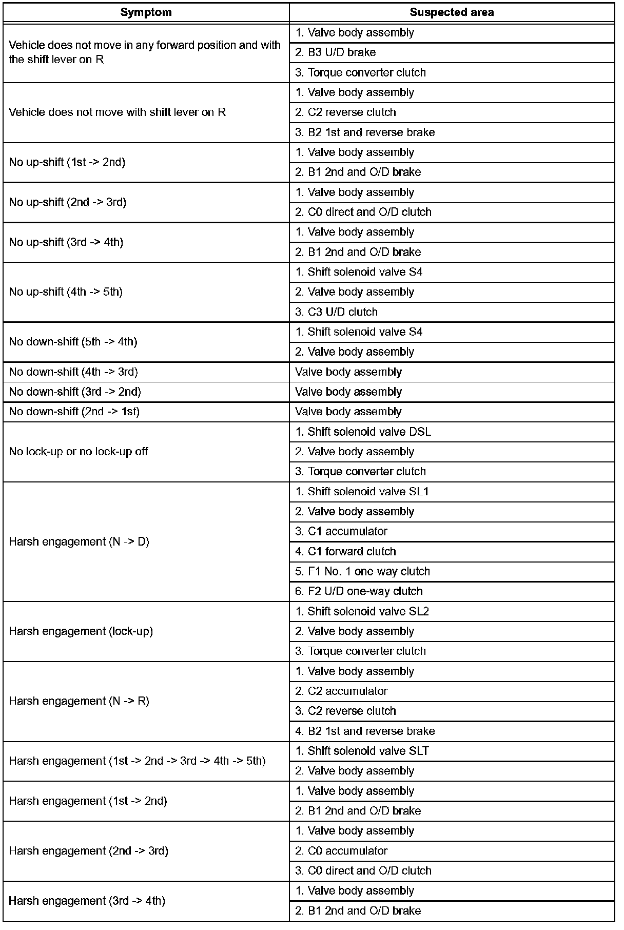^ Use the table to help determine the cause of the problem symptom. The potential causes of the symptoms are listed in order of probability in the "Suspected area" column of the table. Check each symptom by checking the suspected areas in the order they are listed. Replace parts as necessary.