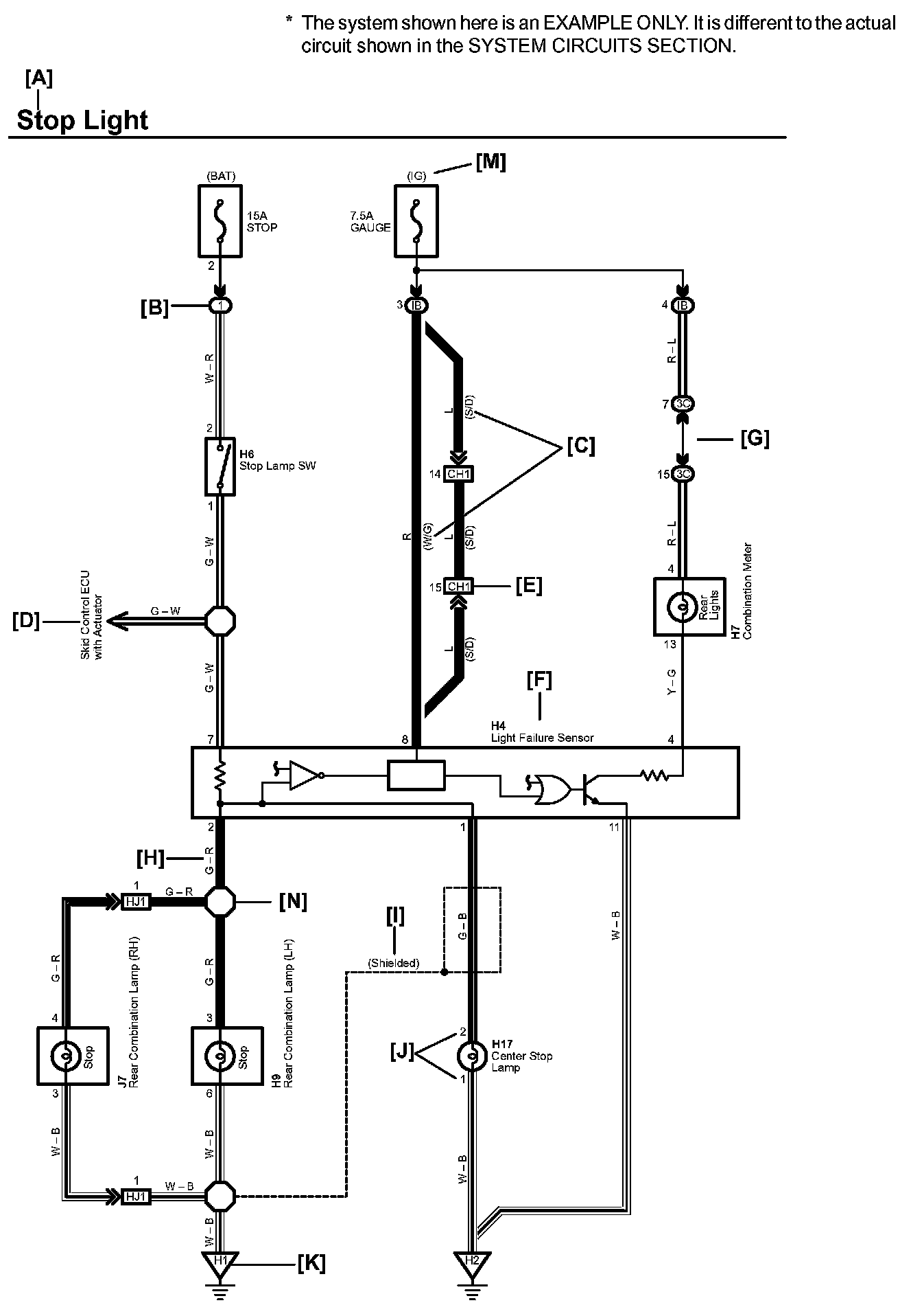 When the ignition SW is turned on and the brake pedal is pressed (Stop lamp SW on), if the stop light circuit is open, the current flowing from TERMINAL 7 of the light failure sensor to TERMINALS 1, 2 changes, so the light failure sensor detects the disconnection and the warning circuit of the light failure sensor is activated.