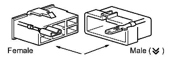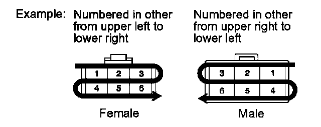 Symbol indicates the male terminal connector. Numbers outside connector codes indicate the pin numbers of both male and female connectors.