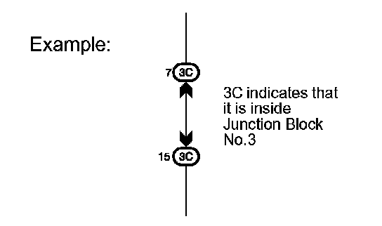 E: Indicates the code for the (male and female) connectors which are used to join two wire harnesses. The connector code consists of two alphabetical and one numerical characters.