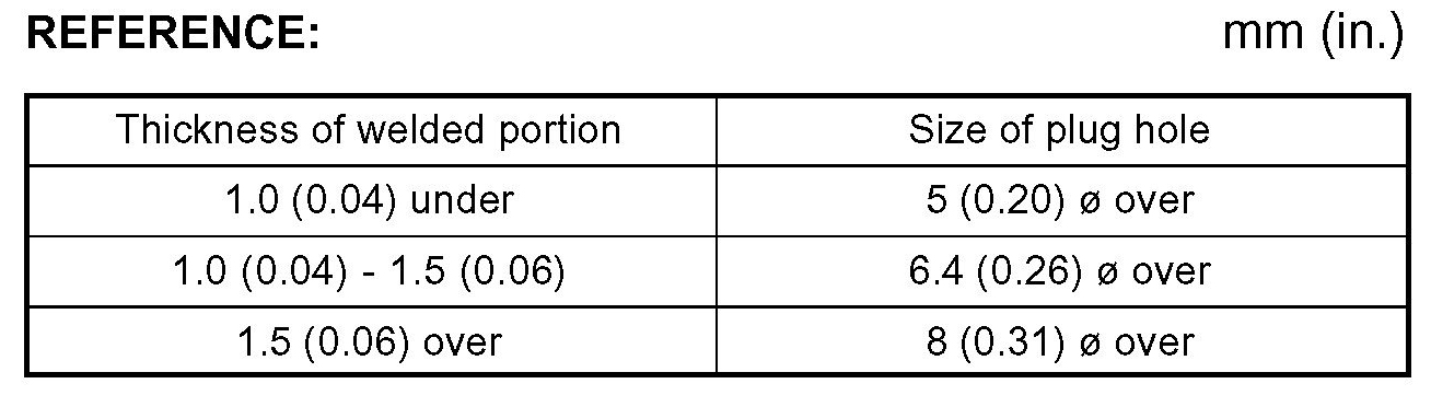 1. When welding panels with a combined thickness of over 3 mm (0.12 in.), use a MIG (Metal Inert Gas) welder for plug welding.