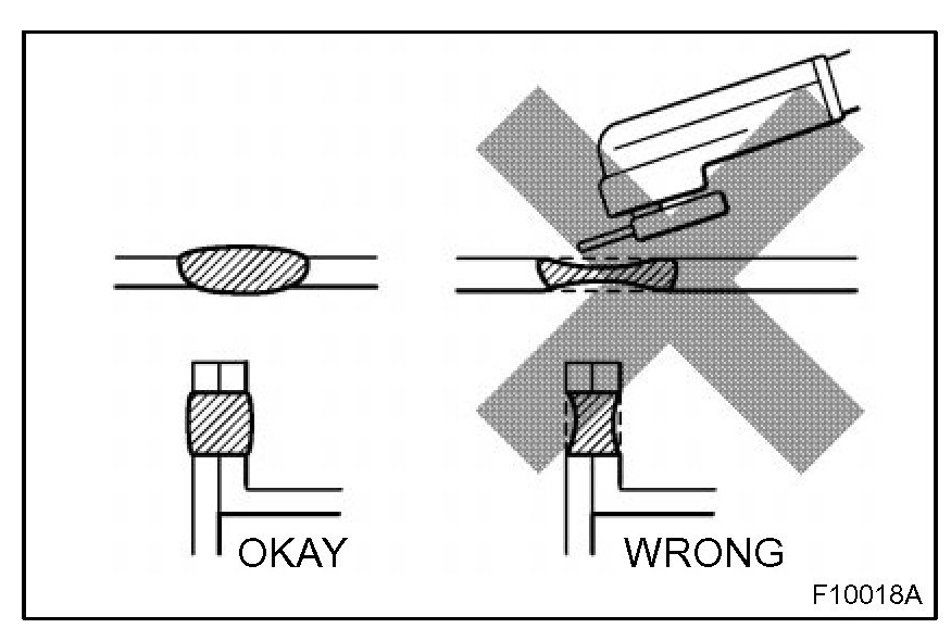 2. Plug welding should be done with a MIG (Metal Inert Gas) welder. Do not gas weld or braze panels at areas other than specified.