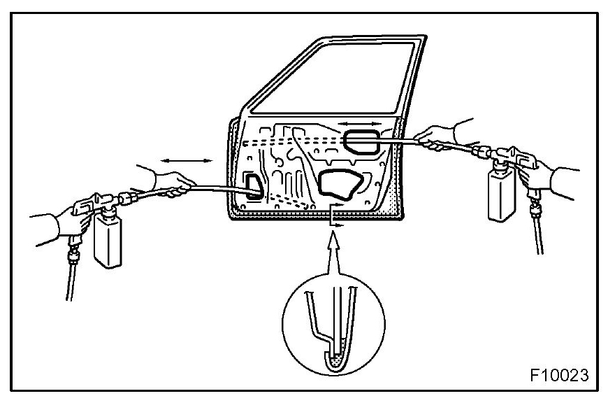 1. To preserve impossible to paint areas from corrosion, always apply sufficient anti-rust agent (wax) to the inside of the hemming areas of the doors and hoods, and around the hinges, or the welded surfaces inside the boxed cross-section structure of the side member, body pillar, etc.