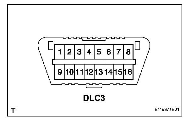 The vehicle's ECM uses ISO 9141-2 for communication. The terminal arrangement of the DLC3 complies with SAE J1962 and matches the ISO 9141-2 format.
