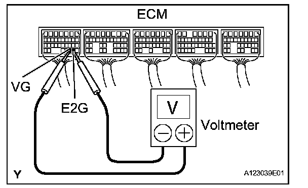2. Connect the positive tester probe of the voltmeter to terminal VG of the ECM and the negative tester probe of the voltmeter to terminal E2G of the ECM.