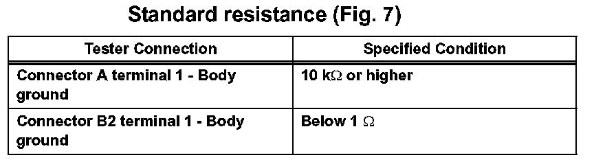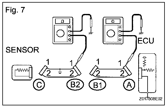 HINT: Measure the resistance while lightly shaking the wire harness vertically and horizontally. If your results match the examples, a short circuit exists between terminal 1 of connector A and terminal 1 of connector C.