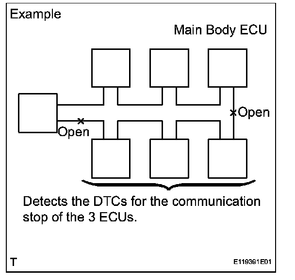 b. If 2 communication buses are open at the position shown in the illustration, DTCs for the ECU communication stop between these 2 buses are indicated.
