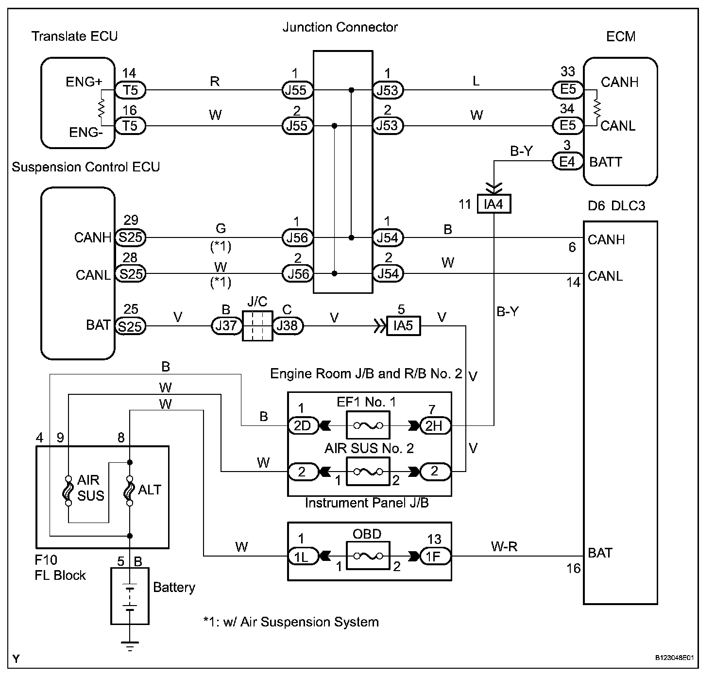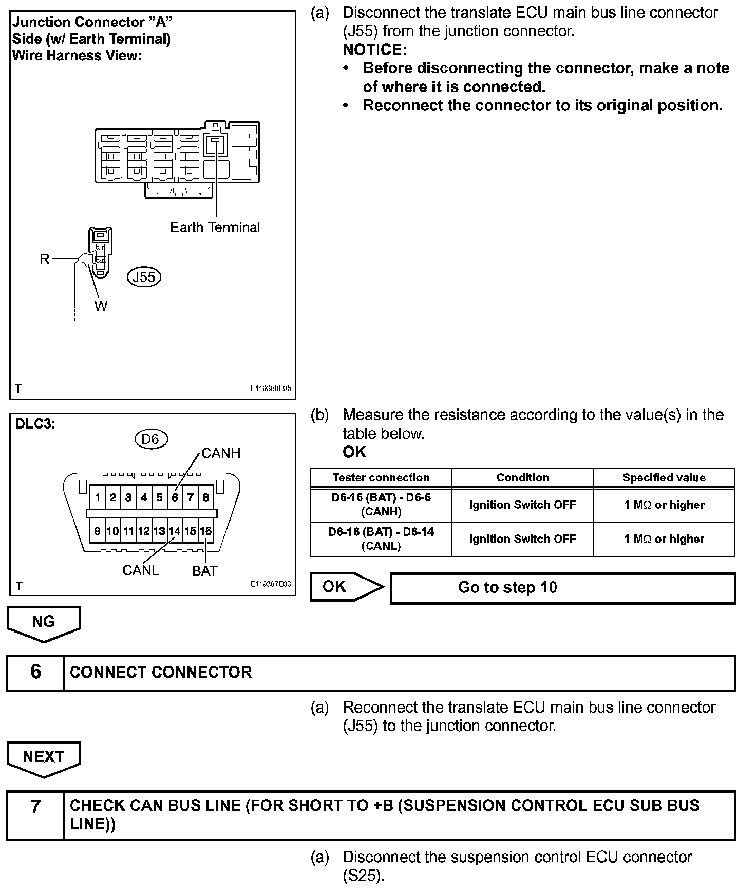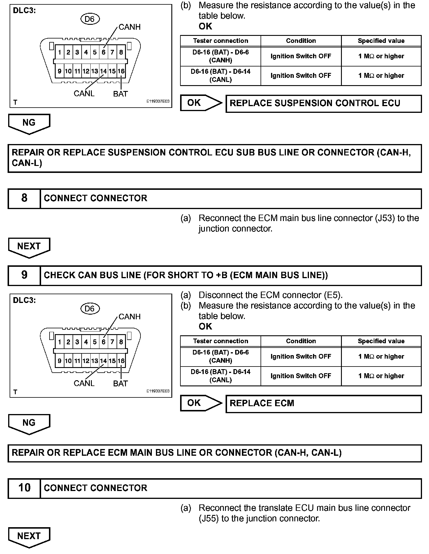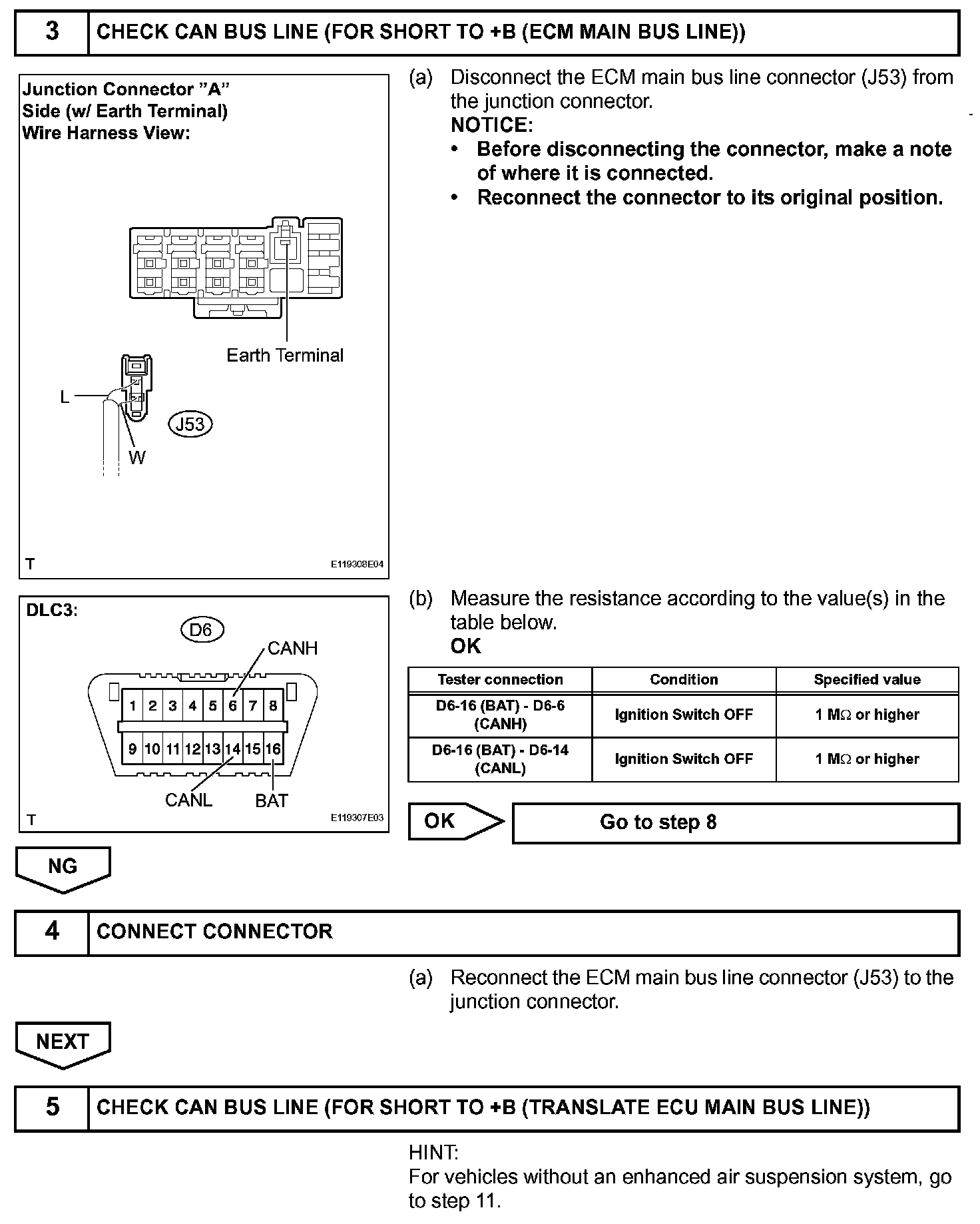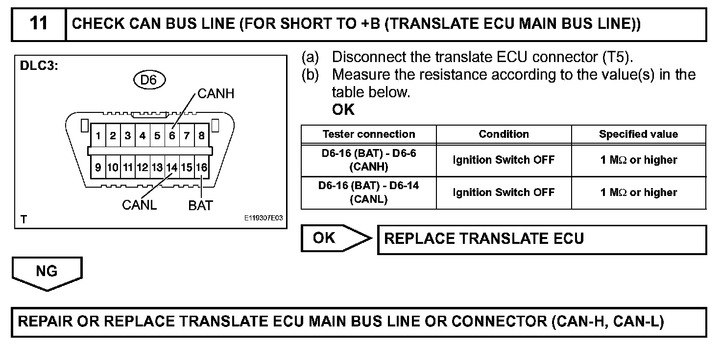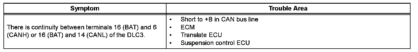 DESCRIPTIONA short to +B is suspected in the CAN bus line when there is continuity between terminals 16 (BAT) and 6 (CANH) or terminals 16 (BAT) and 14 (CANL) of the
