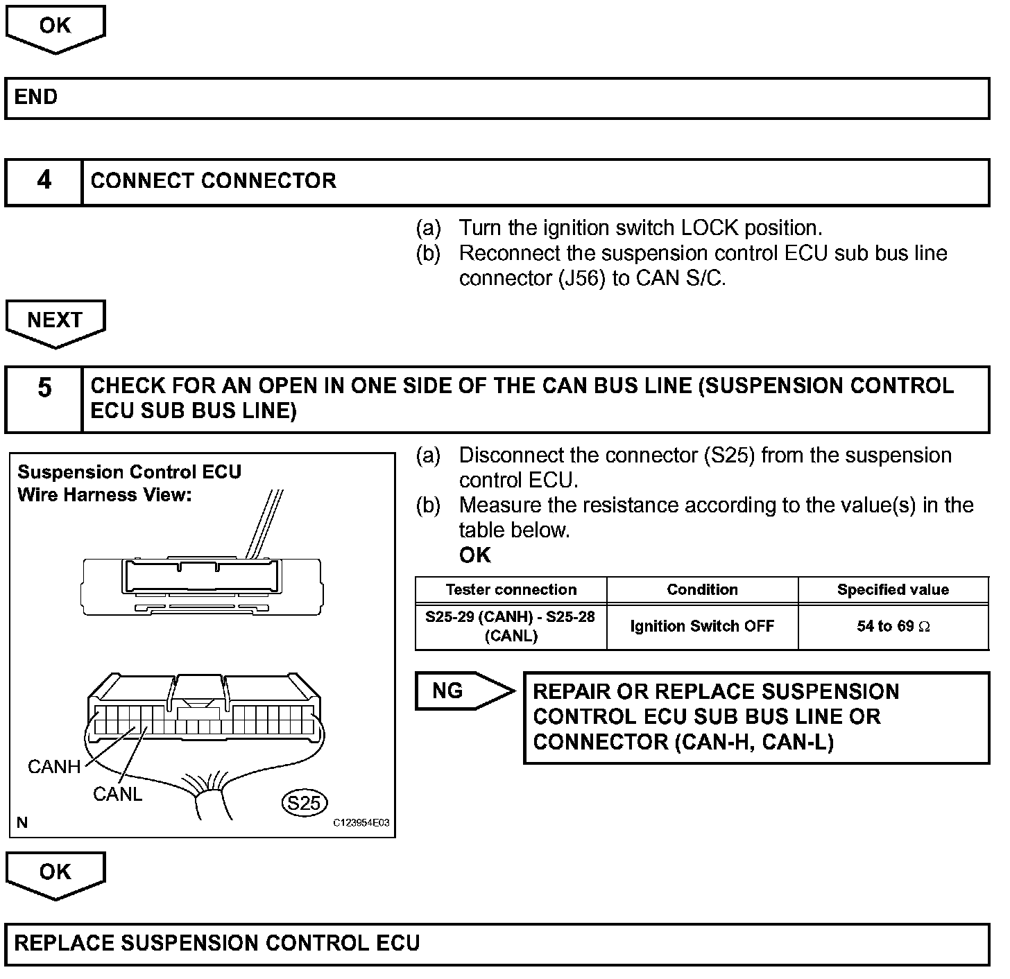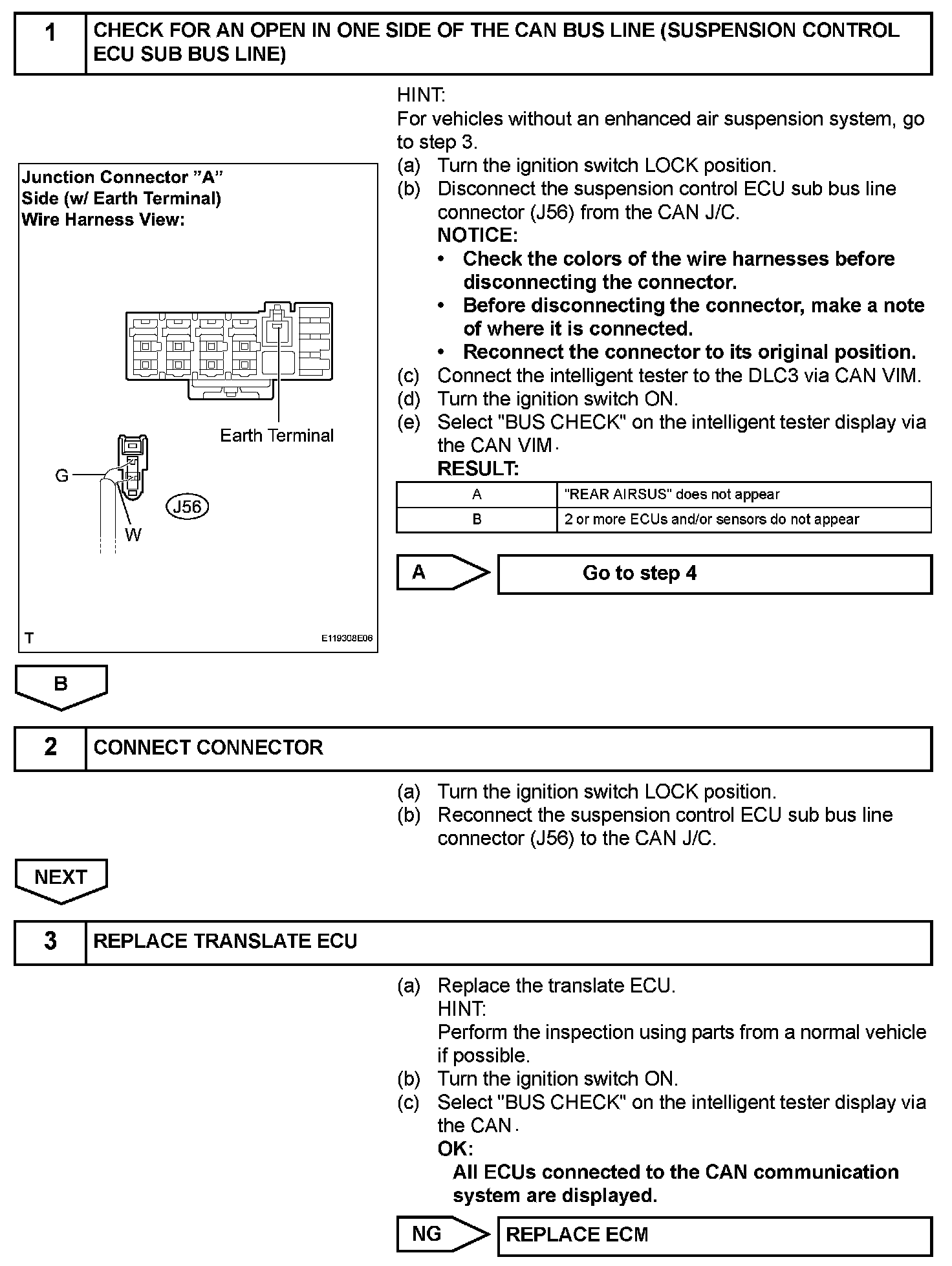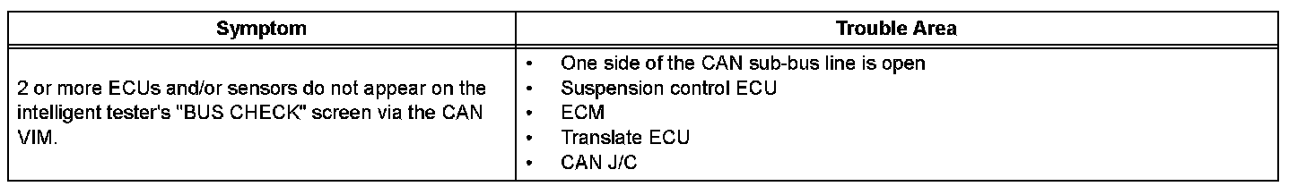 Open in One Side of CAN Sub Bus LineDESCRIPTIONIf 2 or more ECUs and/or sensors do not appear on the intelligent tester's "BUS CHECK" screen via the CAN VIM, one side of the CAN sub-bus line may be open. (One side of the CAN-H [sub-bus line] /CAN- [sub-bus line] of the ECU and/or sensor is open.)