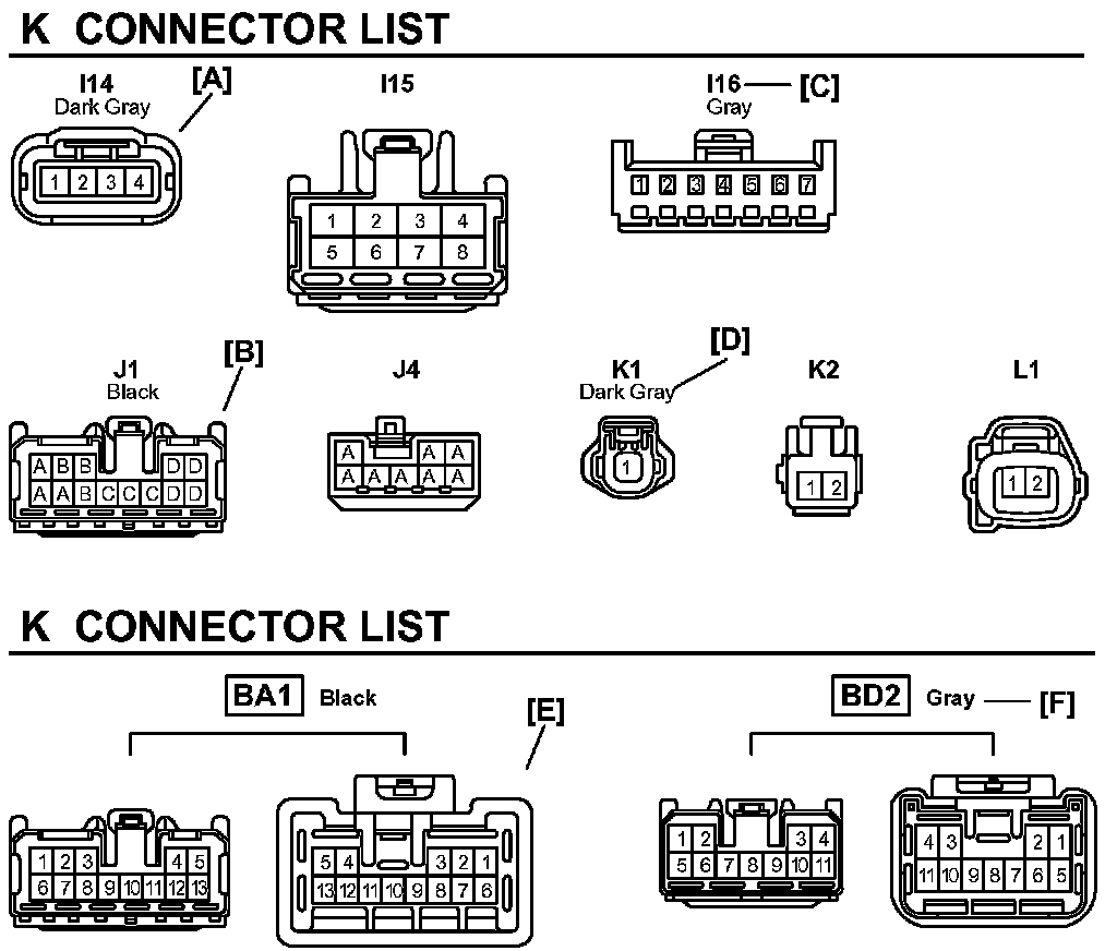 E: Indicates the connector shapes which are used to join wire harnesses.