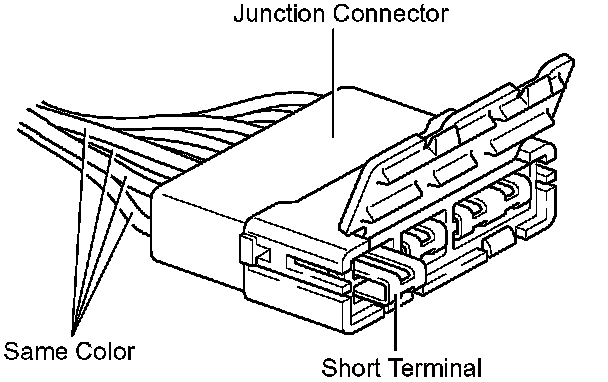 Junction connector in this manual include a short terminal which is connected to a number of wire harnesses. Always perform inspection with the short terminal installed. (When installing the wire harnesses, the harnesses can be connected to any position within the short terminal grouping. Accordingly, in other vehicles,the same position in the short terminal may be connected to a wire harness from a different part.)