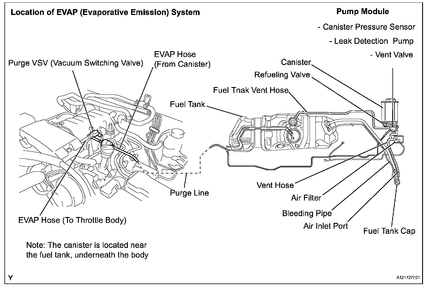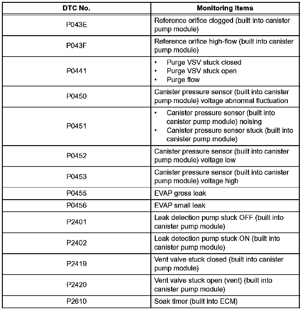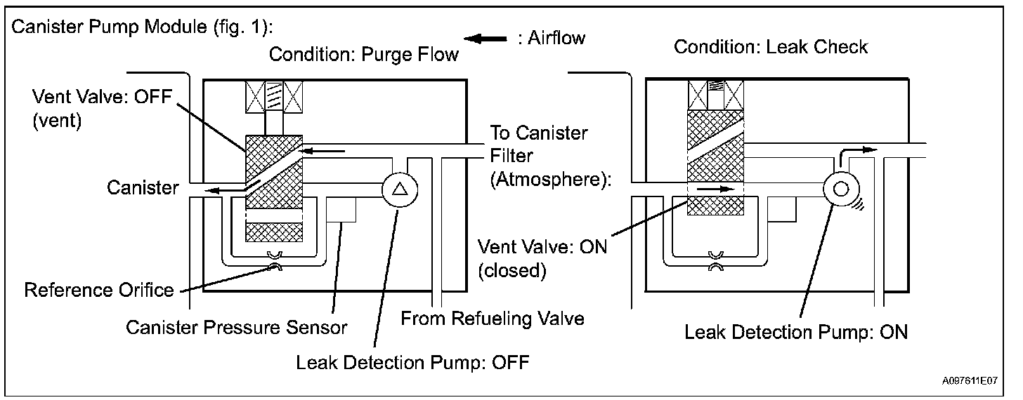 The leak detection pump creates negative pressure (vacuum) in the EVAP system and the pressure is measured. Finally, the ECM monitors for leaks from the EVAP system and malfunctions in both the canister pump module and purge VSV, based on the EVAP pressure.