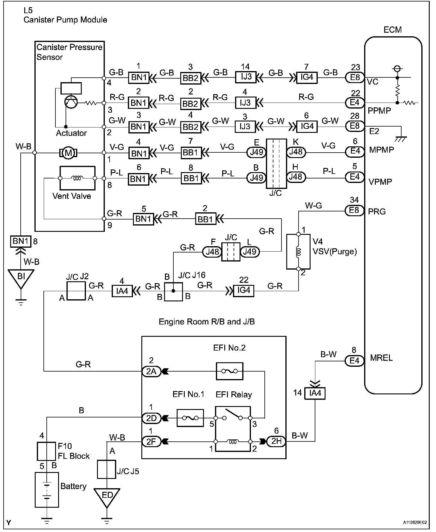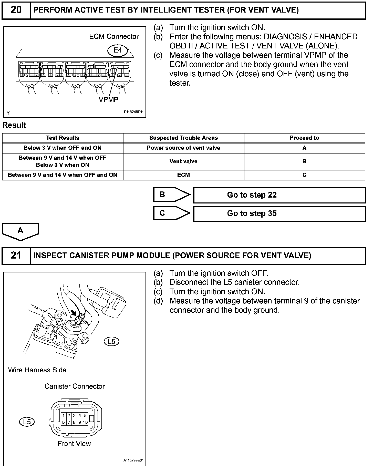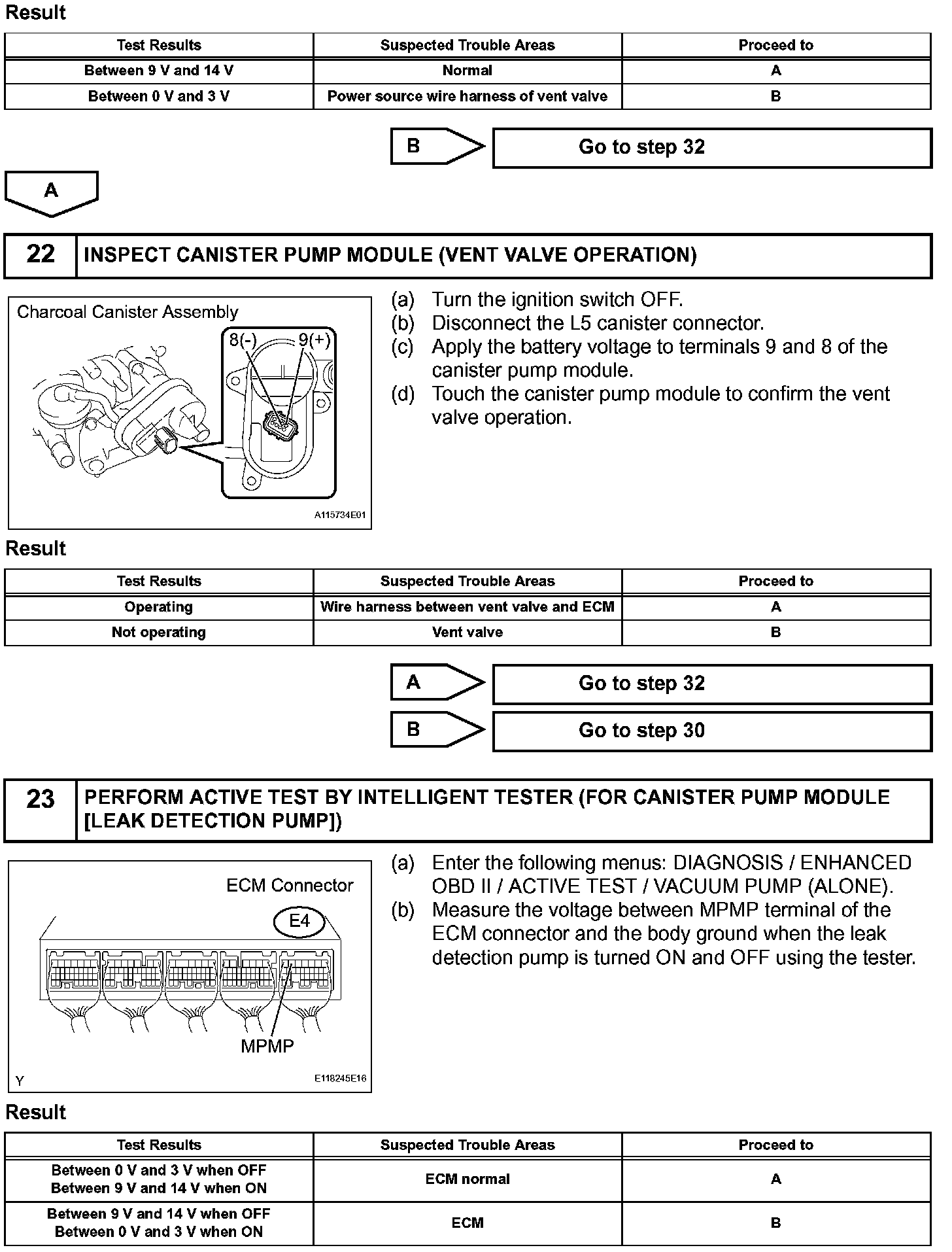The leak detection pump creates negative pressure (vacuum) in the EVAP system and the pressure is measured. Finally, the ECM monitors for leaks from the EVAP system and malfunctions in both the canister pump module and purge VSV, based on the EVAP pressure.
