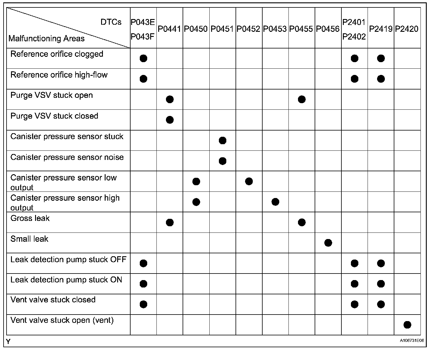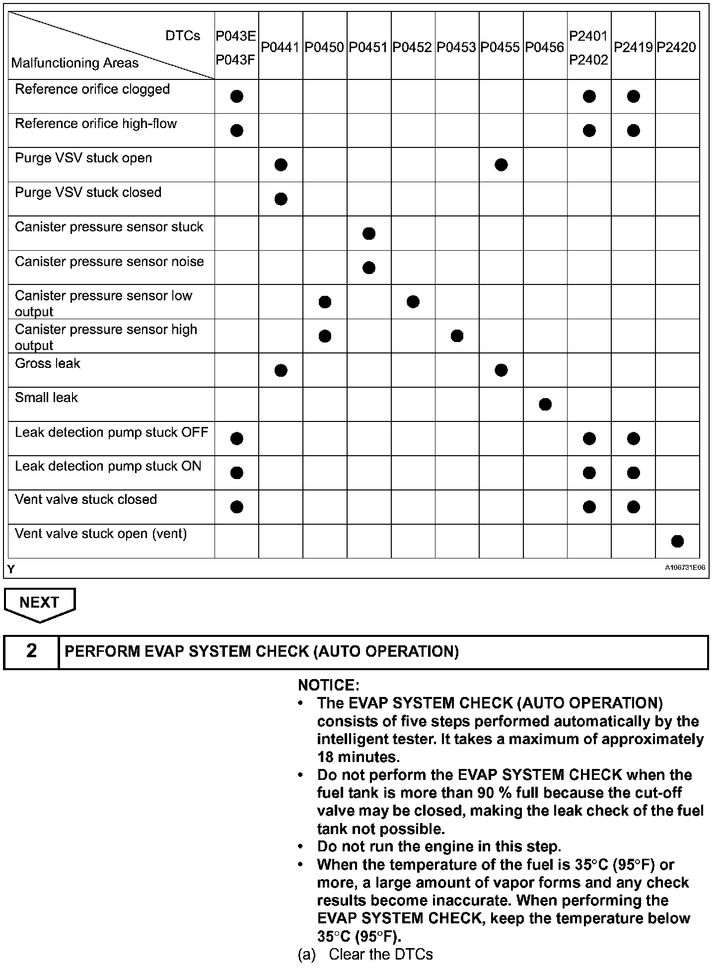 If any EVAP system DTCs are set, the malfunctioning area can be determined using the table.