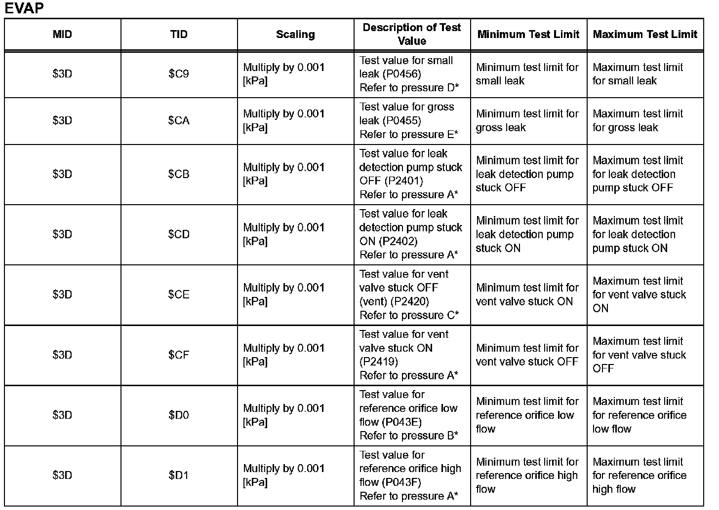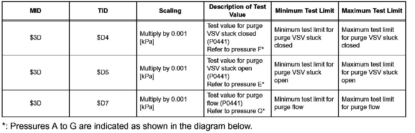 The test value and test limit information are described in the table. This information is included under MONITOR RESULT in the emissions-related DTC sections: